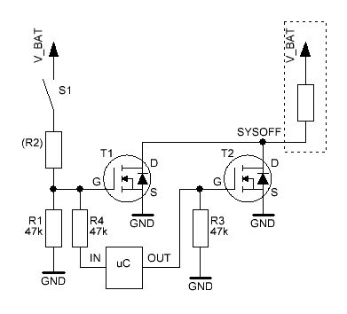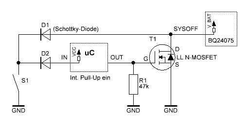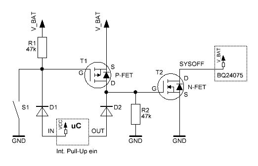Hi, vielleicht steh ich auch nur auf dem Schlauch... Ich möchte eine Taster der GND druchschaltet in meiner Schaltung für 2 Funktionen verwenden! 1: Wenn die Schaltung ausgeschaltet ist, zieht er SYSOFF am BQ24075 auf Low und gibt damit der Schaltung die Batteriespannung.... Ist der µC "hochgefahren" übernimmt er mit einem PortPin und setzt das SYSOFF signal auf Low, um sich die Spannungsversorgung zu erhalten. 2: Ich möchte den Taster aber zur Laufzeit noch an einem PortPin abfragen. Frage: Wenn ich nun alles so anschließ, kann ich den Taster ja nicht mehr abfragen, da er immer auf LOW(durch den PortPin der SYSOFF setzt) ist. Wie geht das, das ich den Jetzt entkopple? Ist sicher ein bekanntes problem... Danke für eure Vorschläge.