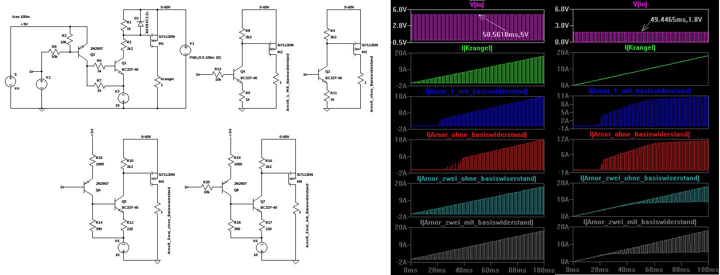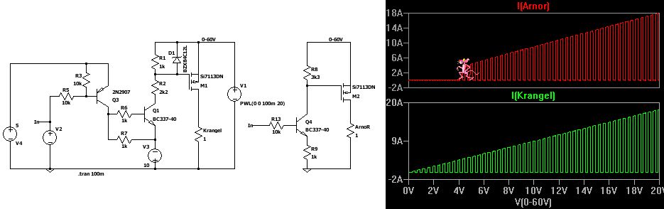 Im Anhang mal ein Vergleich des Zeitverhaltens von Krangels und meiner zweiten Schaltung. Um die Vergleichbarkeit zu ermöglichen, hab ich bei meiner den Gatewiderstand auch auf 1K verringert und die Ansteuerung angepasst (gleicher Spannungshub am Gate, 390R->82R). Schaltfrequenz 20KHz (VG1) AM1 und VF1 (Strom im BC337 und Lastspannung, Schaltung oben) und AM2 und VF2 (Schaltung unten) zeigen, dass der Strom im BC337 in Krangels Schaltung deutlich zu lange fließt und damit am Ausgang ein ganz anderes Tastverhältnis erscheint als am Eingang. Außerdem sind Aufwand und Stromverbrauch aus den 5V- und 10V-Quellen deutlich größer und der Gatespannungshub nimmt mit der Spannung der 60V-Quelle ab und reicht bei sehr niedrigen Spannungen nicht zum Einschalten des PMOS (Ugs=3V bei Vcc60=0).