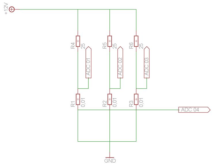 Hallo, ich möchte den Strom messen, der durch einen PC-Lüfter fließt. Dafür habe ich folgenden Widerstand ausgesucht: Hersteller: OHMITE Herst.Bez.: LVK12R010DER Im Anhang ( das ist meine erste Eaglezeichnung ) habe ich mal grob die Schaltung gezeichnet. Der Widerstand hat jeweils ein V = sensing terminal I = current terminal Der Stromausgang des Widerstandes wird mit den anderen 2 mit Masse verbunden, nur ich bin mir gerade nicht ganz sicher, ob ich einfach jeweils ein Sensing Anschluss der 3 Widerstände miteinander verbinden kann, um die genaue Spannung nach dem Widerstand zu messen. Oder würdet ihr es für unnötig halten, da die Messwiderstände ja eh mit Masse verbunden sind und würdet einfach mit 0V nach dem Messwiderstand rechnen ? Tobias