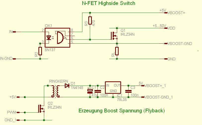 Hallo Leute, Ich wollte mal N-FETs als Highside Schalter anstelle der üblichen P-FETs ausprobieren. Klappt auch soweit, hab jedoch noch ein paar kleinere Probleme und Fragen. Die Schaltung im Anhang ist zur Diskussion stark vereinfacht und entspricht nicht unbedingt der angestrebten Lösung. Für die Gate Spannung des N-FET Q1 wird eine Spannung benötigt die im Q1-On Zustand Vdd um 5..10V übersteigt. Mit dem "Boost Kondesator" Konzept (siehe z.b. IR2111 Highside Treiber) kann man ja dies einfach erreichen, aber ein dauer Q1-On betrieb ist damit nicht möglich. Ich hab daher dafür einfach mal eine Kondensator Pumpe bzw. eine Flyback Schaltung ausprobiert. Die damit erzeigt Spannung hab ich relativ zu Q1-Source aufgehängt und schalte dann mit dieser 5V Hilfsspannung Q1-Gate. Damit erreiche ich bei Vdd 12V und RL 100 Ohm eine Schaltverzögerung (RL relativ zu V-IN) von ca. 450ns (On und Off, 75ns für 6n137, ca.120ns für IRLZ34N, der Rest für die schwachbrüstige Gateansteuerung), OK. Wenn ich aber RL z.B. auf 4.7K erhöhe, steigt die Q1-Off Zeit (gemessen über RL) auf 6µs :( . Warum? Ist dafür eine der Q1 Gate Ladungen verantortlich die sich erst über RL entladen muss?. Gibt es da eine einfache Abhilfe? Wenn ich mir die Spannung über RL anschaue dann gibt es dort hässliche Spikes von ca. 0.8V,600ns Dauer,10Mhz Schwingung mit der PWM Frequenz von Q2 aus der Flyback Schaltung. VBoost+ gegenüber VBoost-GND ist sauber! Aber anscheinend wird das VBoost Potential gegenüber GND so heftig hinundher geschüttelt so dass die Anbindung über RL an GND nicht ausreicht... Hierfür hab ich bisher nur folgende Abhilfe gefunden: 1) die PWM Flanken an Q2 verschleifen. Damit sinkt aber der Wirkungsgrad und Q2 wird heiss! :( 2) Anbindung von VBoost+ oder VBoost-GND an GND über einen Kondensator von mindestens 1..10nF. Damit steigt aber die Q1 Off Zeit bei RL 4.7K von ca. 6µs auf 20µs :( Allerdings bei RL 100Ohm hab ich nachwievor 450ns, :) Frage: Gibt es hier noch andere Möglichkeiten die Spikes zu beseitigen und trotzdem schnelle Q1 Off Zeiten auch bei hochohmigen RL zu erzielen? (Hab noch keine konkrete Anwendung im Sinn, nur so zum Ausloten was drinn ist) Danke schon mal für den Schweiss der Edlen...