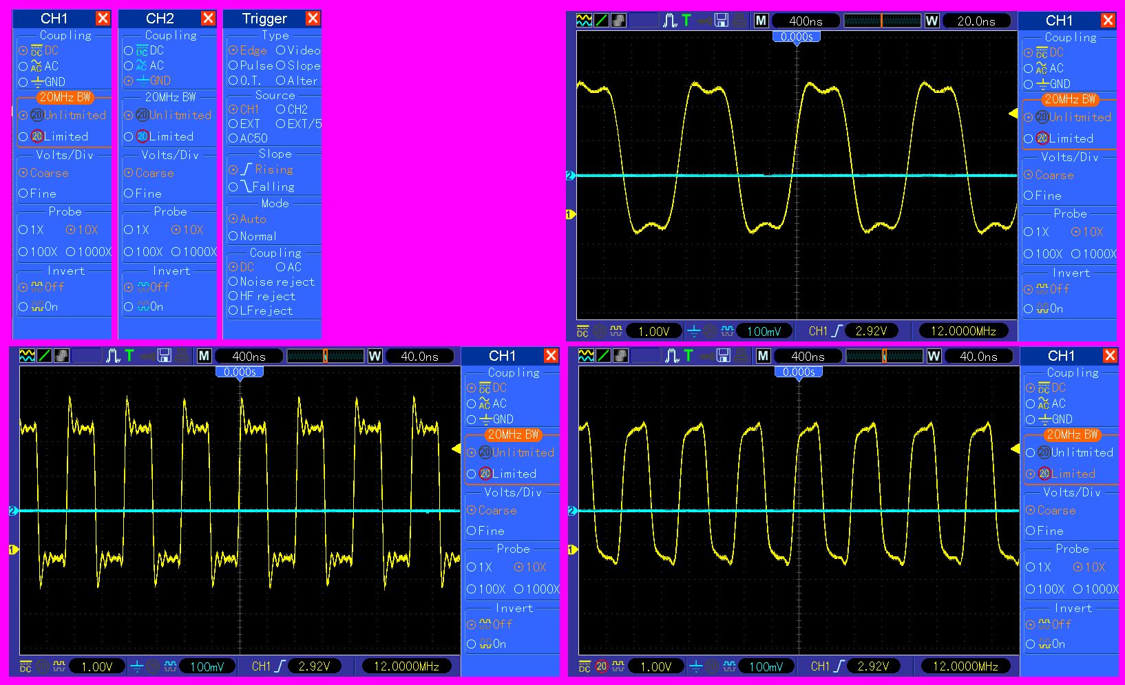 Hallo Carsten! hier einige screenshots, um die einstellungen zu zeigen: --> siehe anhang, grad gemerkt dass man keine image hoster links im beitrag haben kann, "spam"... Die unteren bilder zeigen, in einer einstellung, wo das scope keinen blödsinn macht, volle bandbreite vs. limited 20MHz. Sieht schon anders aus als das, was es macht, wenn es mist macht (rechts oben). > Hast du noch ein zweites "rein Analoges" Skope welches du Parallel > schalten kannst um mal zu überprüfen ob dieser Effekt erst bei der > Signalverarbeitung "im Skope" auftritt, Nein, leider nicht. Mit glück bis nächstes wochenende ein ausgeliehendes, aber es stehet noch nicht fest. Ich habe allerdings bei jemand anderem mit nem Tetronix (2 GS/s) scope das gleiche angeguckt, und da gab es keine seltsamen effekte. Und wie gesagt, die sache tritt ja nur auf, wenn der 2. channel auch aktiv ist - ist der nicht an, scheint alles normal, oder jedenfalls größere bandbreite als wenn der fehler auftritt. Ein sinus signal nahe 100 MHz zu testen wäre jetzt nett, aber ich hab keine quelle für sowas, momentan :-) > Firmwareversion. 2.06.3 ( 110531.1 ) Btw., ich hab's auch bei eevblog gepostet. Falles es dort zu interessantem input kommt, werde ich das hier anmerken. Gruß, -unshaven