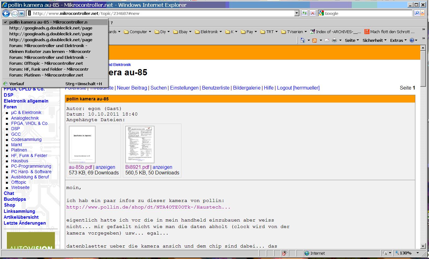 Seit einiger Zeit habe ich folgendes Problem: Wenn ich Artikel auf mikrocontroller.net anklicke, habe ich in der History mehrere googleads-Links stehen (siehe Bild). Beim Klicken auf 'Zurück' muss ich dann mehrmals klicken (unterschiedliche Anzahl :-( ) um auf die vorhergehende MC.NET Seite zu kommen. Das nervt, weil ich öfters übers Ziel herausschiesse. Weis jemand, an was das liegen könnte und wie man das ändern kann? WinXP IE8.0.6001 vielen Dank