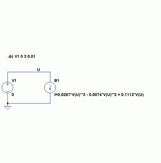 Hi, ich würde gerne eine einfache Schaltung mit einer Diode in LTSpice simulieren. Habe dazu die UI Kennlinie aus dem Datenblatt mit einer quadratischen Funktion angenähert. I= 0,0267U^3 - 0,0074U^2 + 0,1112U + 0,1079. Gibt es eine Möglichkeit in LTSpice die Schaltung mithilfe der Funktion zu simulieren?