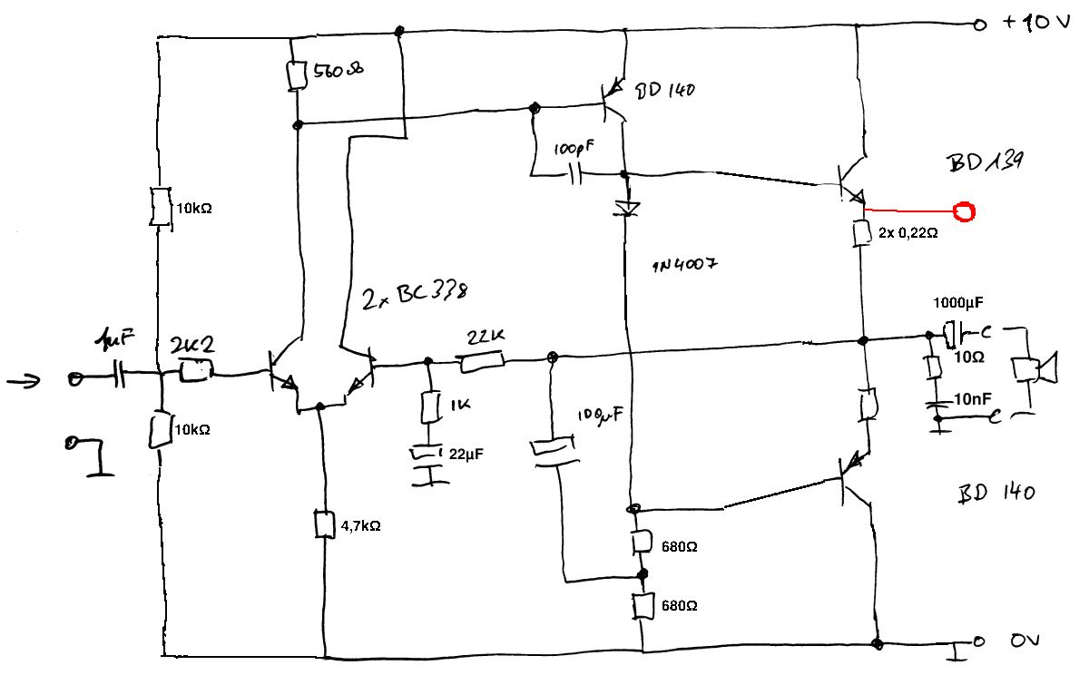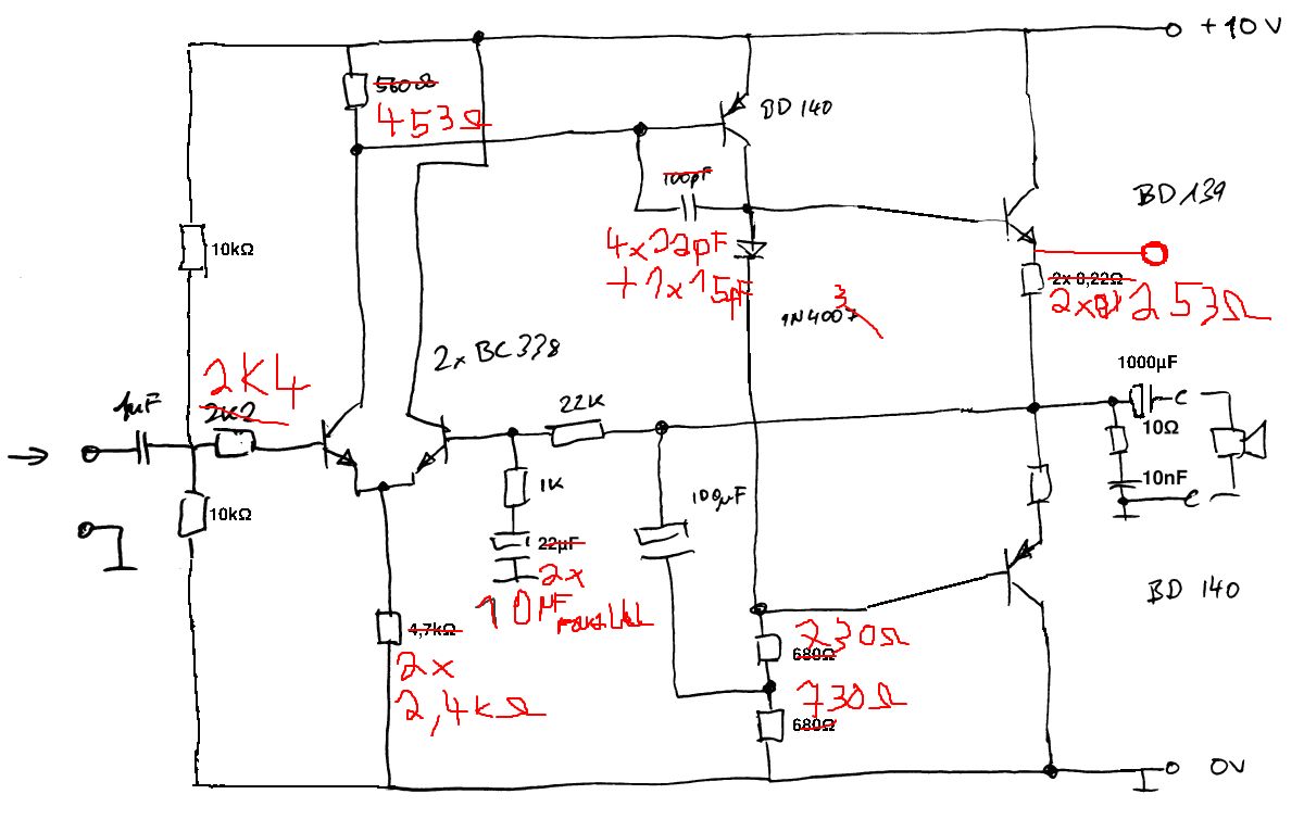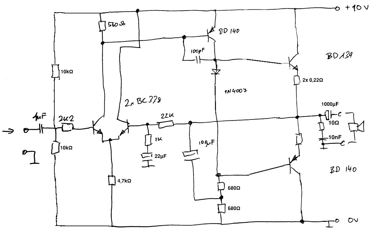 Hallo, ich habe heute einen alten "Ford" Lautsprecher gefunden (20W 4Ohm) nun wollte ich dazu mal eine Verstärkerschaltung aufbauen! Mir stehen Transisitoren BC338, BD140 und BD139 zur Verfügung. Ich habe schon mal versucht eine einfache Emitterschaltung mit dem BD 139 aufzubauen aber dann knackt der Lautsprecher nur. (vermutlich falsch dimensioniert) Ich verwende ein Netzeil, dass mir 10V DC liefert und mit max. 1A zu belasten ist! Eingangssignal ist aus meinem MP3-Player und bewegt sich im Bereich von 200 bis 600 mV! Ist das überhaupt mit den genannten Transistoren möglich?