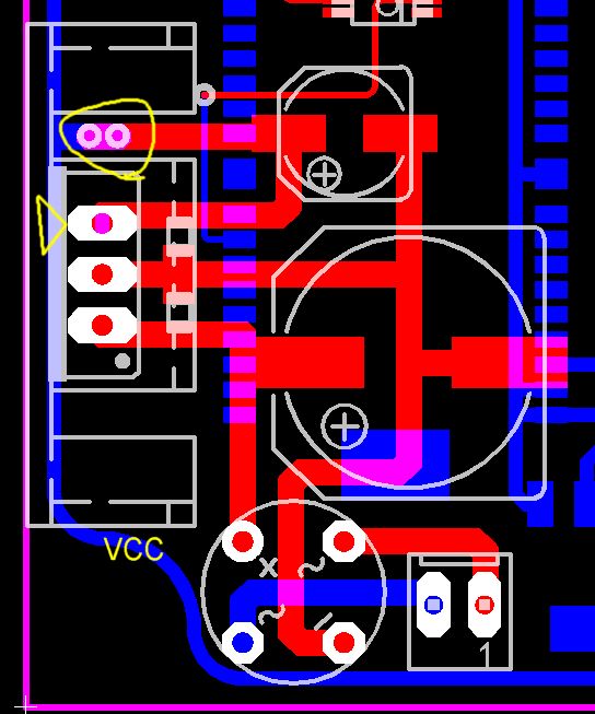 Der Kringel zeigt die 2 Vias, die ich jetzt eingefügt habe. VCC ist die blaue Bahn aussen rum (unten). Auf der Unterseite ist ein Bluetooth-Modul. Der Pfeil zeig an, wo ich gerne VCC direkt vom Regler zur VCC-Bahn führen würde - wäre nur 1mm.