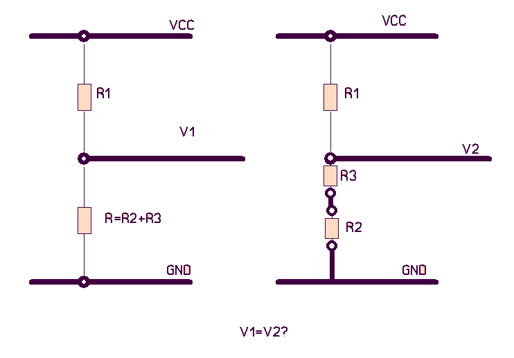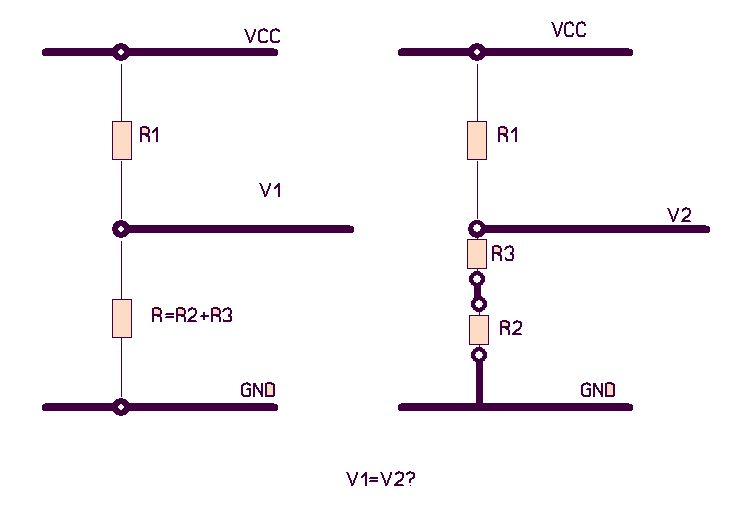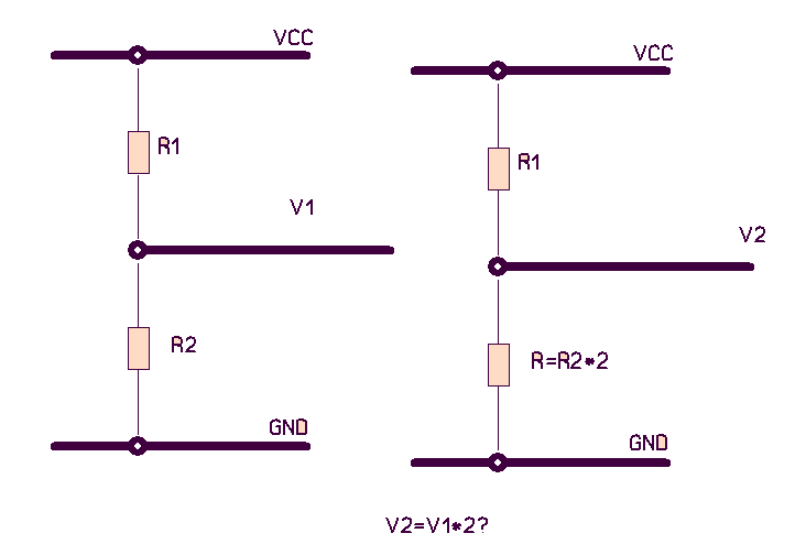 die spannung ändert sich nur proportional wenn der gesamt-R geleichbleibt... vielleicht besserverständlich wenn man das nachrechnet... I (durch die widerstände) ist ja Vcc/(R1+R2) bzw Vcc/(R1+2*R2) und V1 ist I*R2 bzw V2=I*(2*R2) beides zusammen ergibt V1=Vcc*R2/(R1+R2) bzw V2=Vcc+2R2/(R1+2R2) ka ob dir das was gefolfen hat... btw im übrigen wär latex hier im forum nett ;) 73