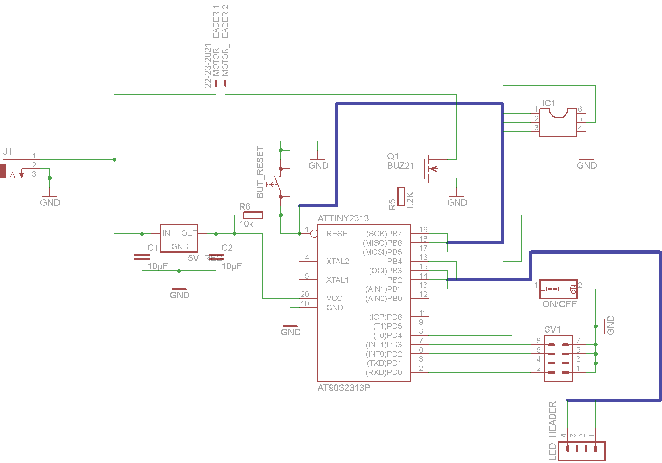 Zwischen GND und VCC gehört NAH an den Controller noch ein 100nF-Kondensator. Ist an dem "Motor-Anschluss" etwas dran? Wenn ja, lass das erstmal weg. Was ist IC1? Wie ist es mit dem uC verbunden, das geht aus dem Plan nicht hervor.