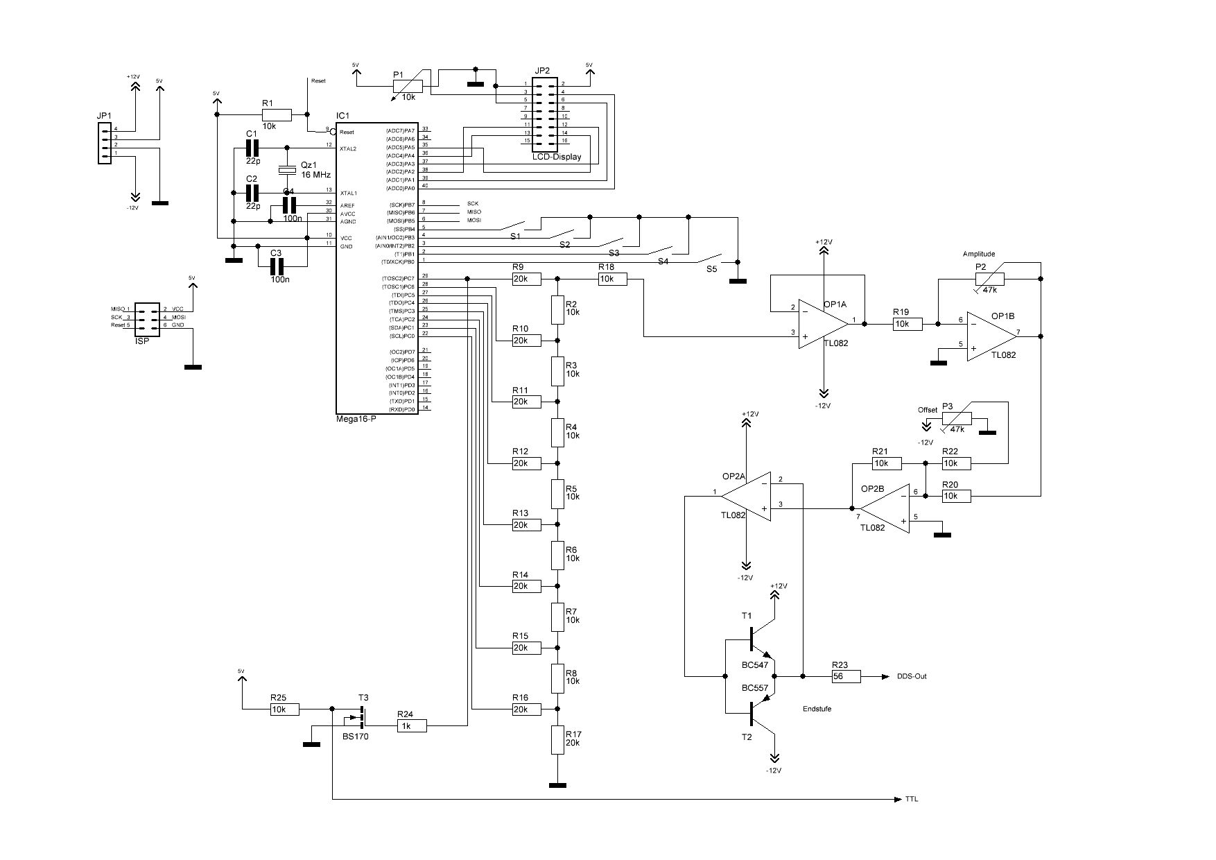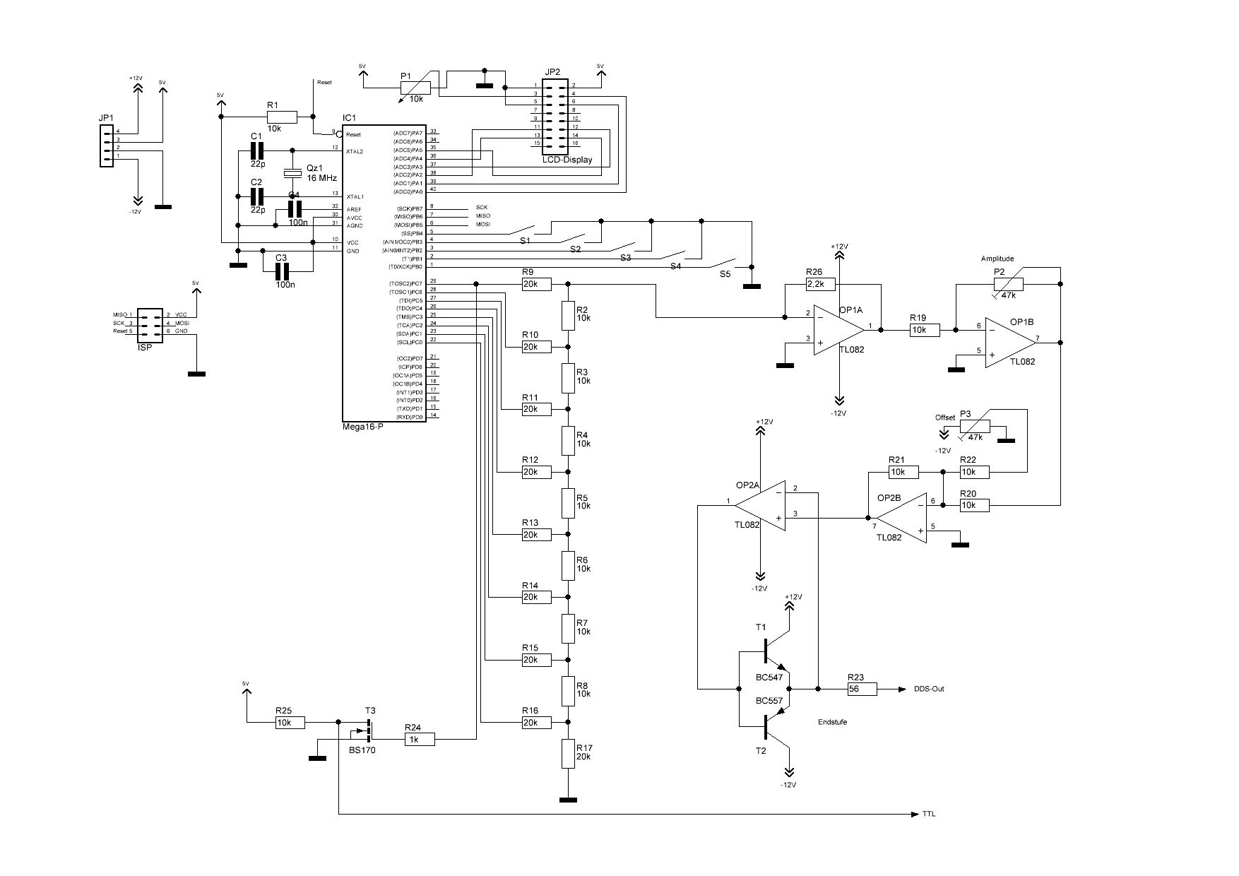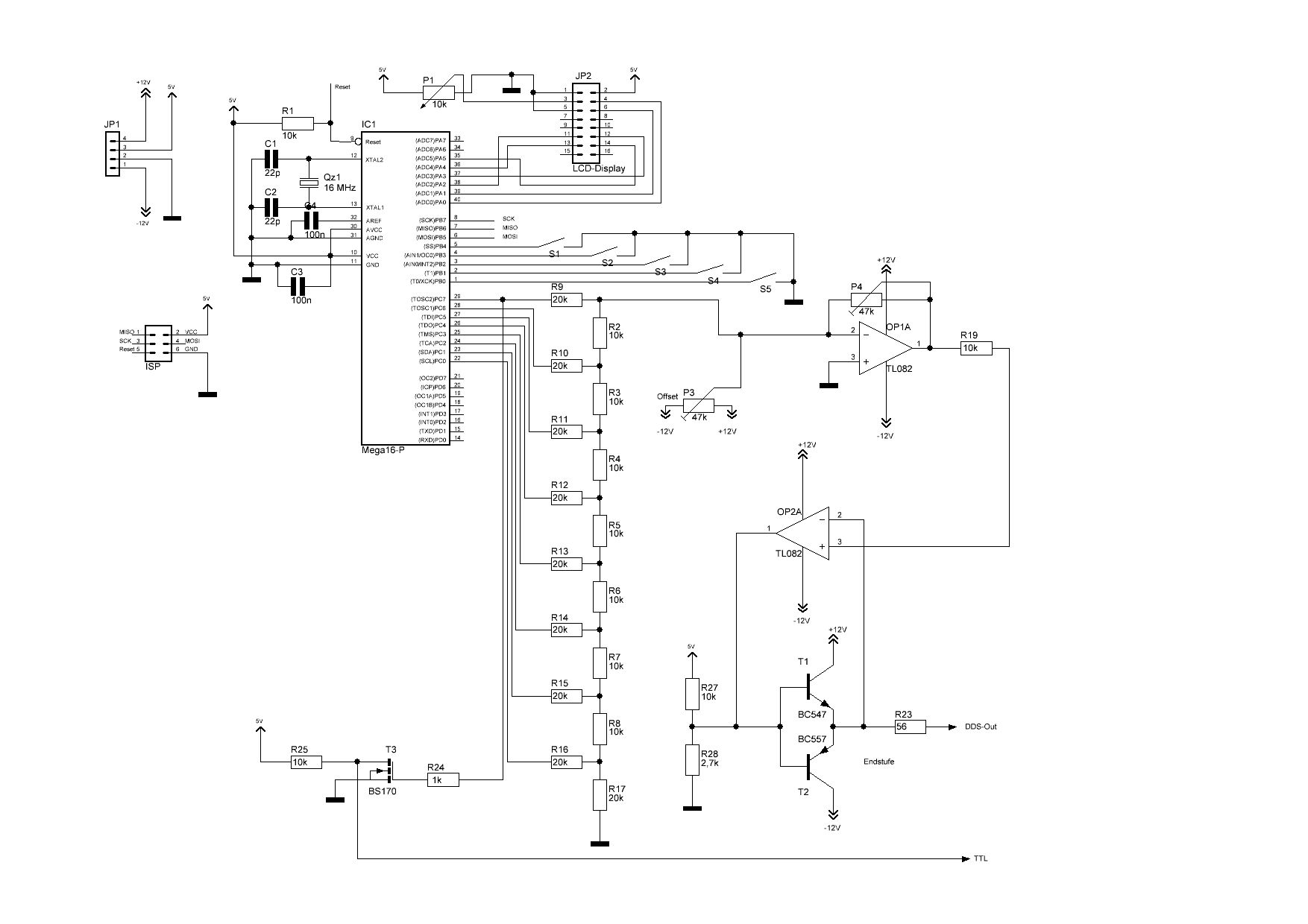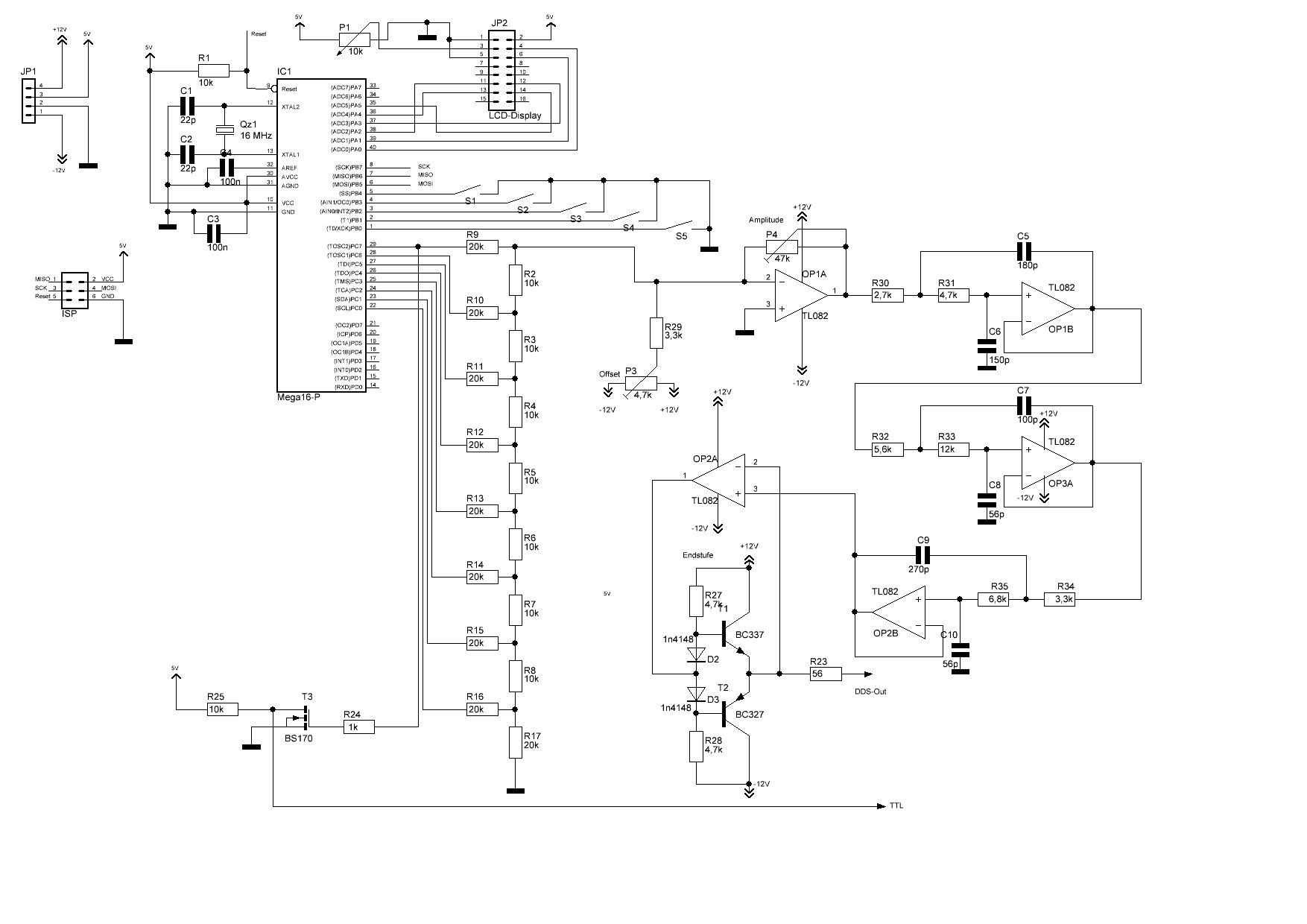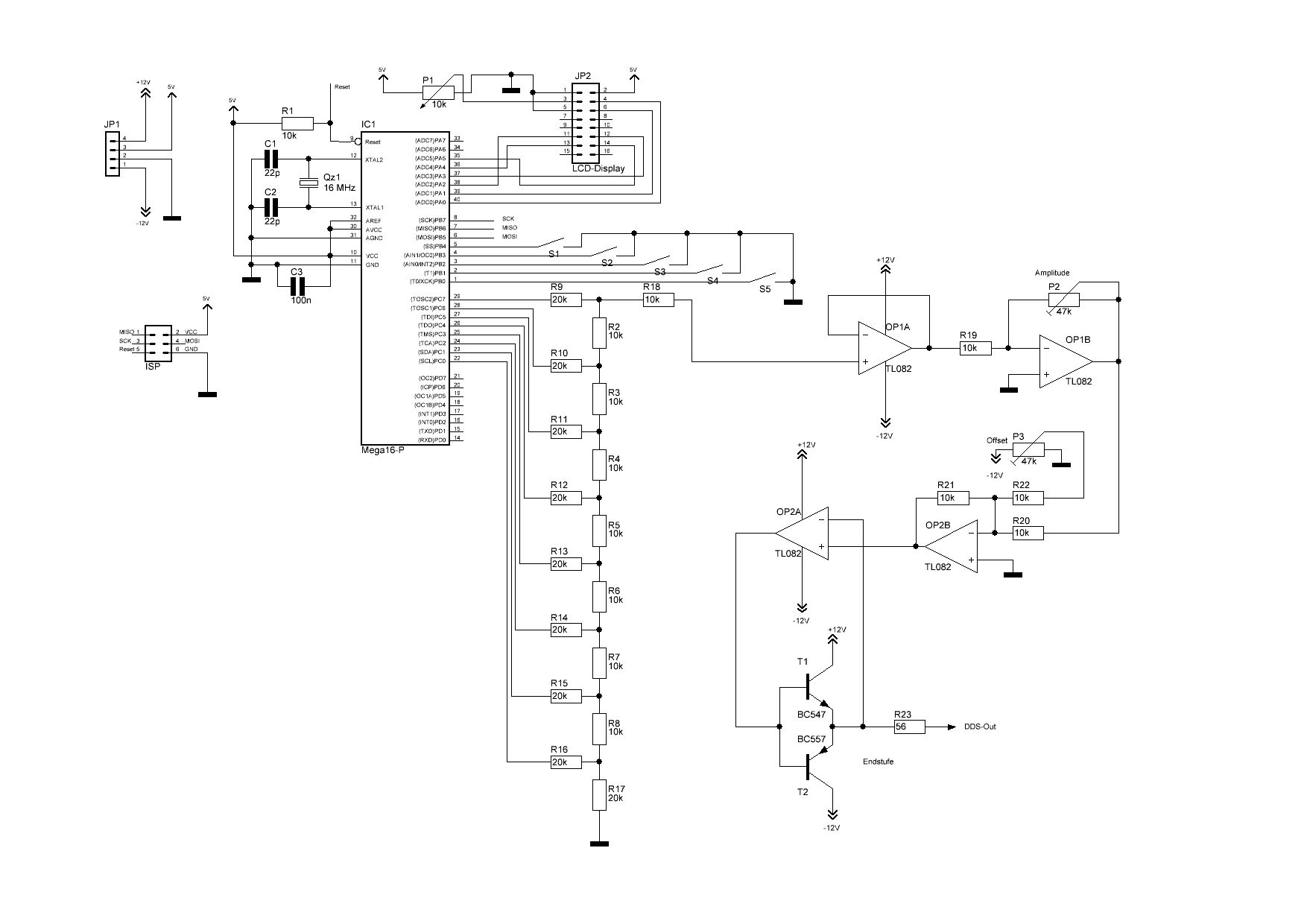 Aref nicht an VCC anlegen! Zwar wird der AD-Wandler nicht verwendet, aber wenn durch einen Programmierfehler der Wandler eingeschaltet wird, kann Vcc die interne uref-Erzeugung zerstören: lieber den Anschluss offen lassen. Für die ersten Schritte würde ich den analogen Teil garnicht bestücken, die 12V können tödlich sein für den Kontroller. Genauso erst einmal das Display und die Tasten garnicht anschließen/bestücken. Erst wenn die eigentliche DDS-Routine sauber abläuft, die weitere Bestückung vornehmen und die Tasten- und Display-Routinen ins Programm aufnehmen, also Schritt für Schritt vorangehen. Den analogen Teil finde ich nicht so gut: Wenn man das Poti für den Offset an den +Eingang des zweiten OP-Amp legt, kann man den dritten einsparen. Die Endstufe ist auch die einfachste mögliche Lösung: etwas Ruhestrom bei den beiden Transistoren würde nicht schlecht sein. Anspruchsvolle analog-Verstärker erforden mehr Aufwand. Da liegt der Teufel im Detail, wenn man Schwingschutz auch bei komplizierter Last und hohen Spannungshub mit wenig Verzerrungen beim Nulldurchgang haben möchte.