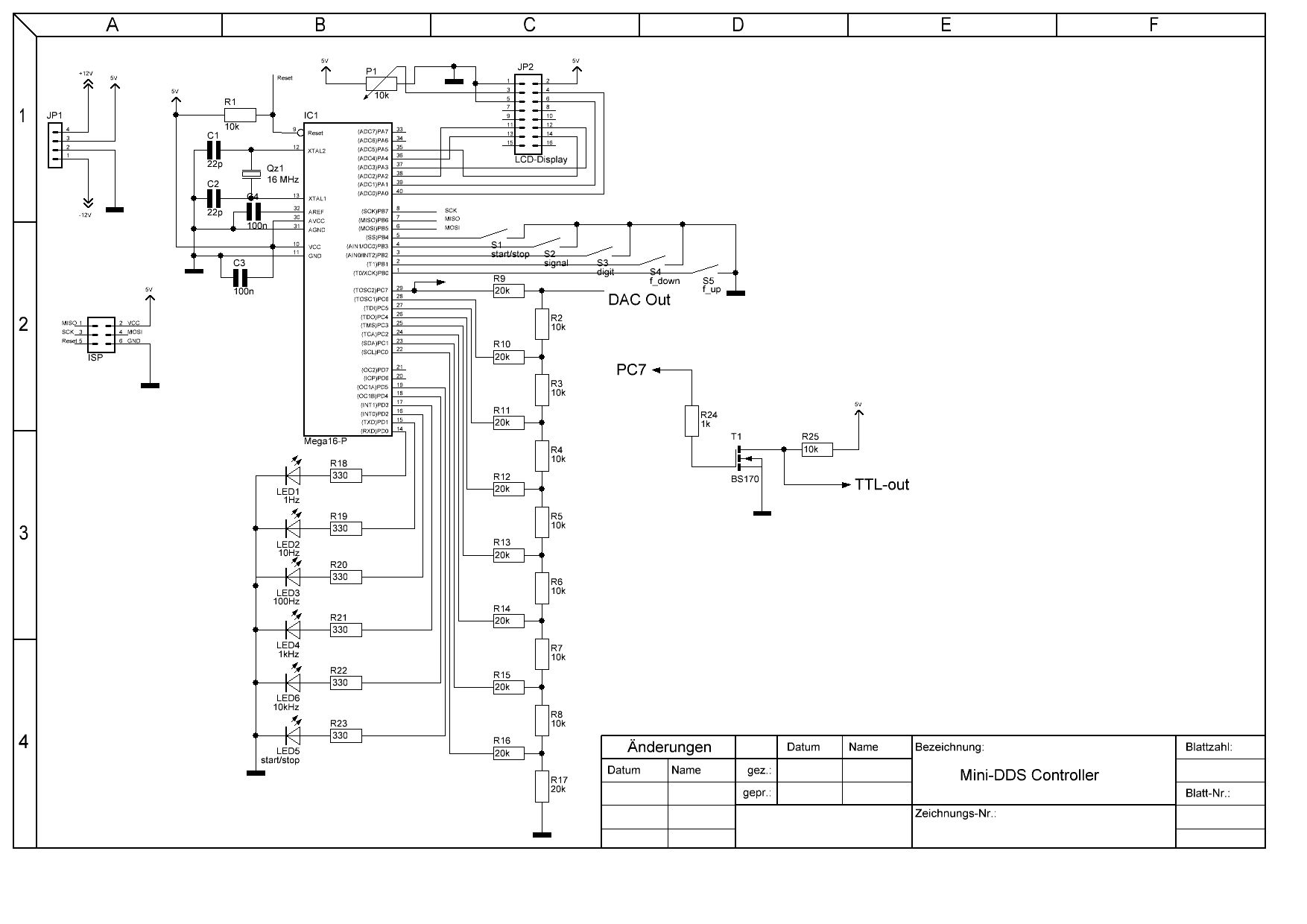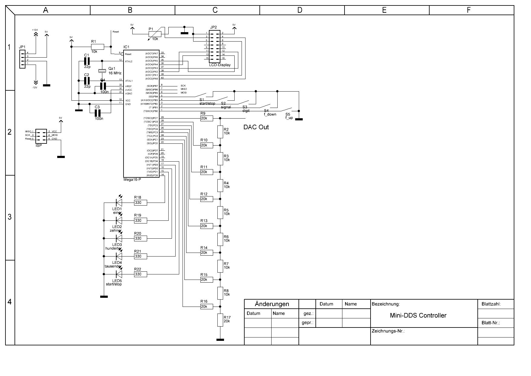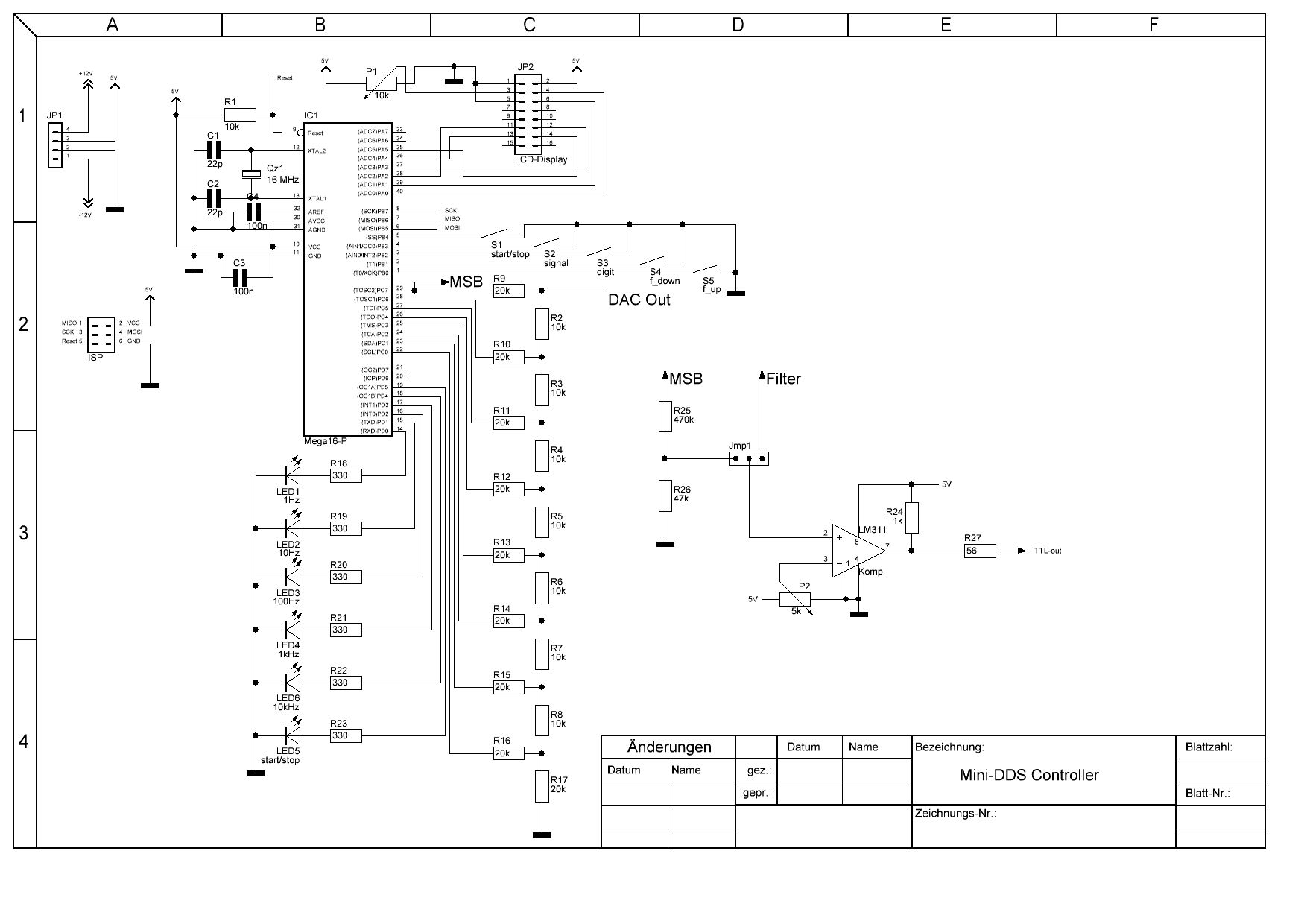 Hallo, ich mache gerade die ersten gehversuche einen DDS-Generator zu bauen. Ich habe den Schaltplan mal angehangen, und möchte eure meinung dazu hören, wo ich was verbessern könnte.
