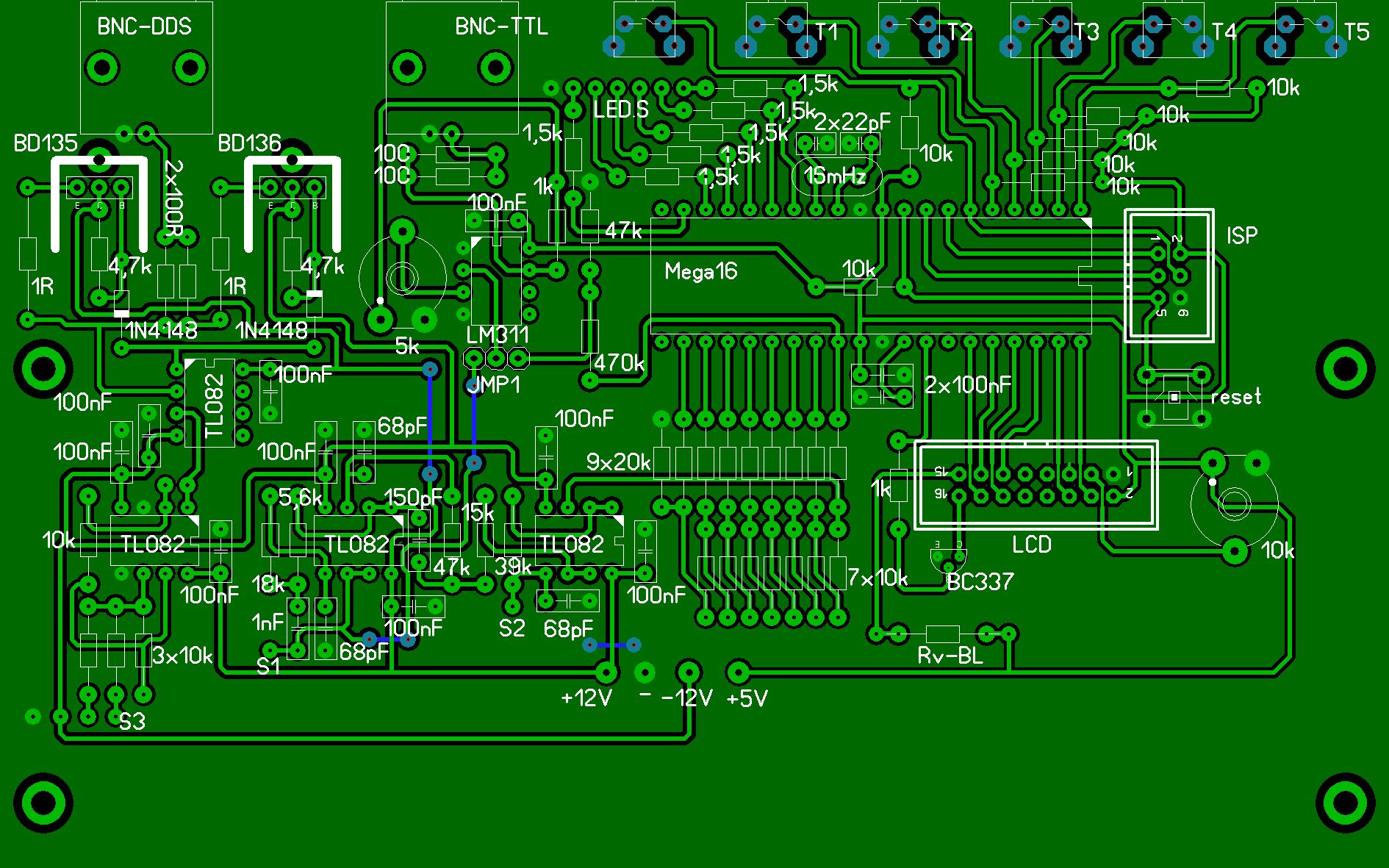 So, ich habe das ganze nach den angehangenen Plänen mal aufgebaut und es läuft alles bestens. Die TTL-erzeugung habe ich wälbar gemacht weil ich festgestellt habe, das in den unteren Frequenzen es über den MSB-Spannungsteiler, und in den oberen Frequenzen über den Filter die besten ergebnisse bringt.
