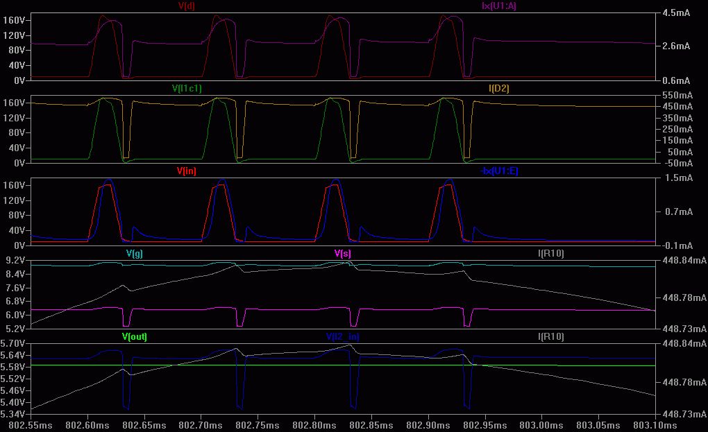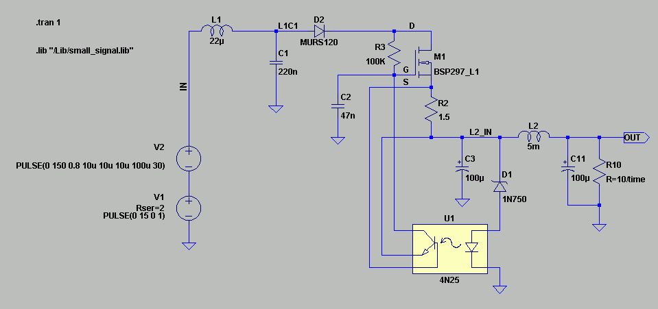 Ich mach mal einen Vorschlag für ne neue Schaltung. Habe sie mit LTspice simuliert und etwas ansatzweise optimiert. Gut für 3,3 oder 5V und 100mA. Mit größerem MOSFET auch Ampere-Bereich. Ist halt kein Schaltnetzteil. Die Schaltung sollte selbst Chancen haben eine abgewackelte Batterie zu überleben, also wenn die Lichtmaschine zur Furie wird und das Kfz ein älteres ohne zentralem Transientenschutz ist. Ihr dürft es verbessern! Strombegrenzung geht durch R2. D1 bestimmt die Ausgangsspannung. In der Simulation ist ein Burst drin, sowie eine Eingangsspannungsrampe und Ausgangsstromrampe. Die Ausgangsspannung beträgt momentan ca. 5,5V - was einen LDO ohne Kühlkörperzwang ermöglichen würde. Wenn die angeschlossene Schaltung es nicht superstabil haben will, dann reicht die Regelung ohne Nachregler aus. Die Bauelemente sind gängig und billig. L1 ist eine Stabkerndrossel. C1 Folie 200V oder so. Stimulatoren habe ich leider noch keine definiert. Hat die einer in SPICE? Vielleicht hat einer noch eine Idee für Verbesserungen? Mag andere Störungen simulieren?