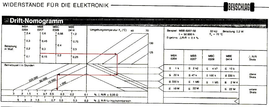 >kann ein handelsüblichen Metall/Kohleschicht Widerstand altern, also so >das sich auch sein Widerstand messbar verändert? Früher gab es dafür in den Datenblättern Drift-Nomogramme. Einfach dem roten Pfeil folgen...