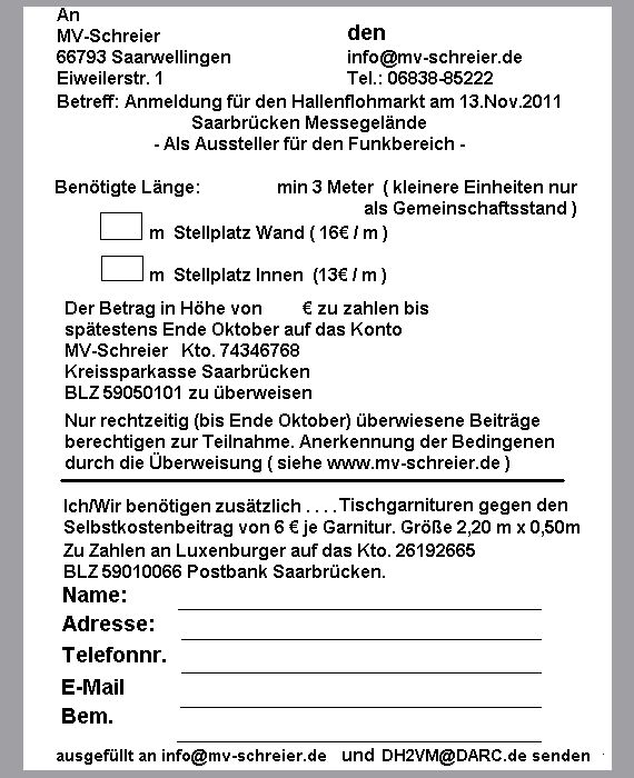 Am 13.11.2011 öffnen sich in Saarbrücken auf dem Messegelände die Tore für die Saarbrücker Amateur Funk Ausstellung kurz SAFA genannt. Nach einem Jahr Pause hat Saarbrücken wieder eine Funkausstellung. Der Schwerpunkt liegt nicht nur auf dem Verkauf von Amateurfunk relevanten Artikel, sondern es soll auch ein Treff für Funkamateure aus Frankreich, Luxemburg und dem südwest deutschen Raum sein. Und für die Mikrocontroller Fans wird eine Vorführung mit Atmel Prozessoren durchgeführt. Anmeldeschluss für Aussteller ist offiziell Montag der 31.10.2011. ( 2 Tage später geht auch noch) Weitere Info auf www.DARC.de/Q/SAFA - Wer noch mithelfen möchte melde sich unter dh2vm (ett) darc.de Albert DH2VM