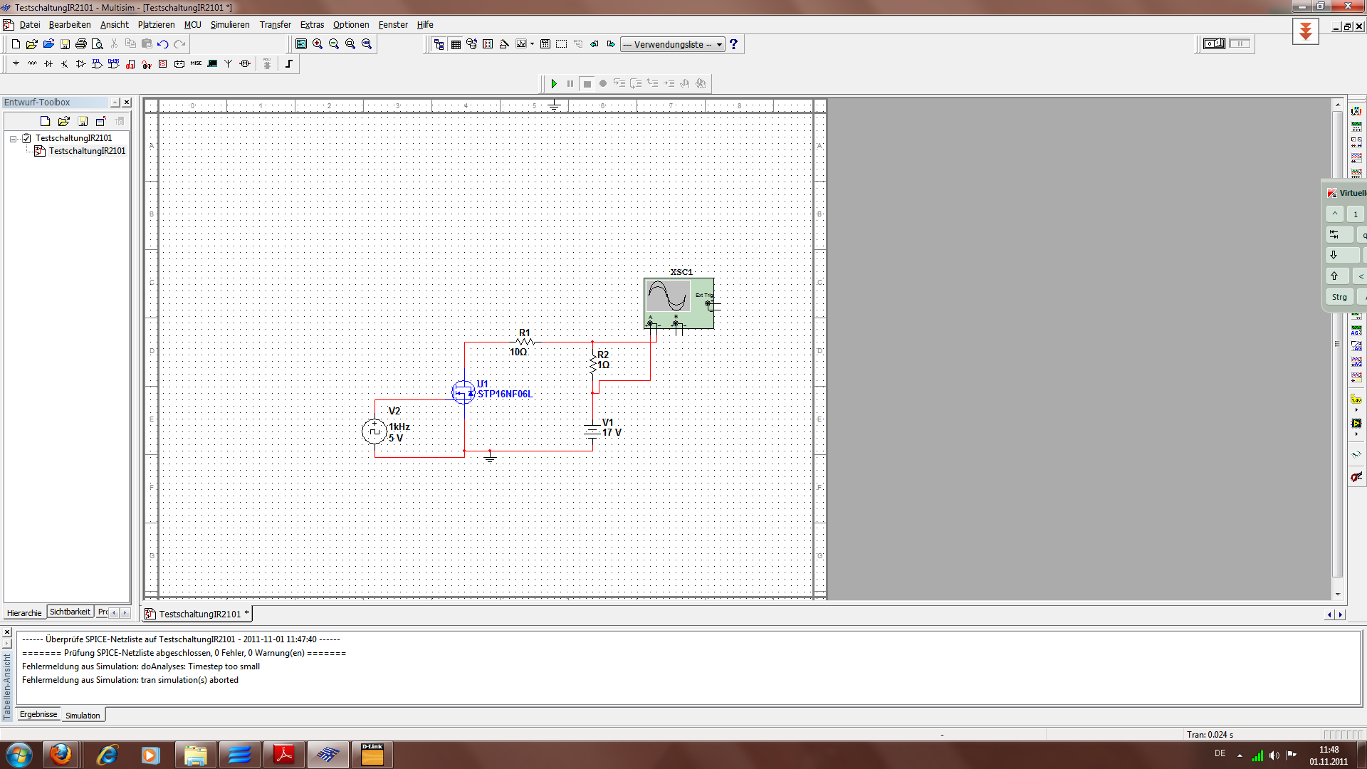 Hallo Bernd vielen Dank fuer Deinen Kommentar. Tatsächlich wenn ich einen Gatewiderstand von 10 Ohm wähle, dann läuft die Simulation durch. Nur das Ergebnis ist nicht plausibel. Wenn ich füer den n-Kanal Mosfet STP16NF06L das Pinning aus dem Datenblatt oder das Pinning von einem anderen N-Kanal Mosfet aus der Bauelemete-Datenbank nehme, dann ist das Oszillogramm wie nach Anhang. Es scheint mir so, als ob die Syntax des Spice Models STP16NF06L noch nicht korrekt ist. Hast Du eine Idee, was man verbessern könnte. Gruesse Michael