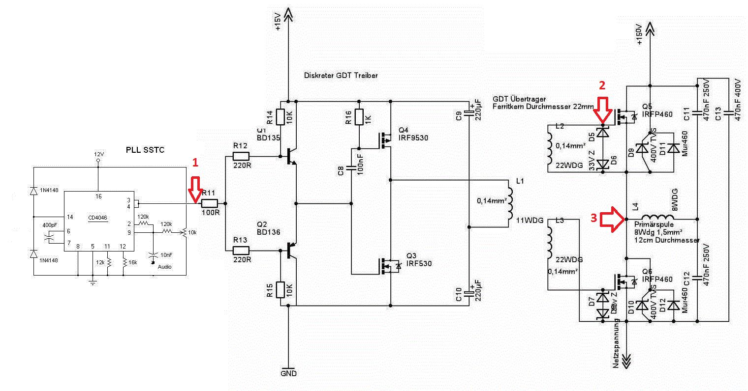 Falsches Forum, würde eher zu CTC Labs oder 4hv.org raten. Anyway, mögliche Ansätze: - richtiger Treiber, z.B. so: http://stevehv.4hv.org/newdriver08/DRSSTC_pndriver1_3b.pdf grad den Treiberteil rausschneiden. Dieser diskrete Treiber ist nicht so dolle. - 33V am Gate ist zuviel für den MOSFET. 18V tun es. 33V sind vielleicht für fette IGBT mit +-30V Gatespannung noch akzeptabel, bei overdrive. - Alle Leitungen verdrillen. - Kondi's so dicht als möglich an Treiberendstufe. und am wahrscheinlichsten: Der GDT ist falsch: - richtiges Material (Ferrit > 4000AL) - je nach Frequenz 10-20Windungen (je höher, desto weniger) - bifilar wickeln (erst verdrillen, dann wickeln). - kleine Widerstände vor das Gate, ca. 5-10Ohm beseitigt die Schwingungen, welche Du auf dem Oszi siehst (dennoch: Das Signal ist schlecht, nicht steil genug). Den Stromverbrauch mit angeschlossenen MOSFET bei der Frequenz mag durchaus normal sein - da wird schon etwas Leistung benötigt, um die Kapazitäten umzuladen (und irgendwo sind da auch Widerstände). R16 kann auch gut heiss werden.