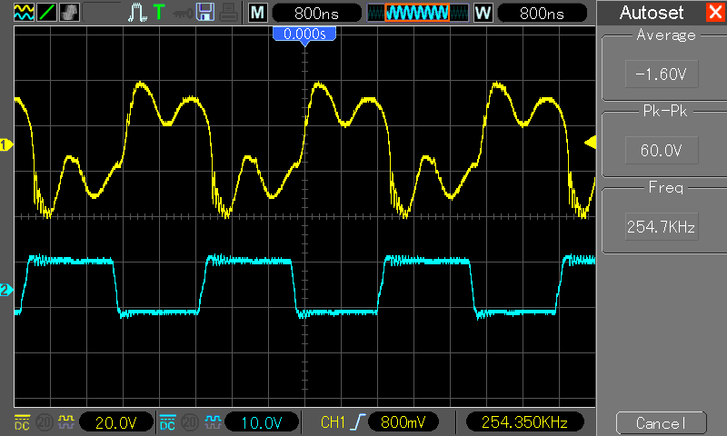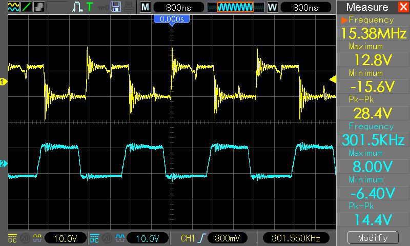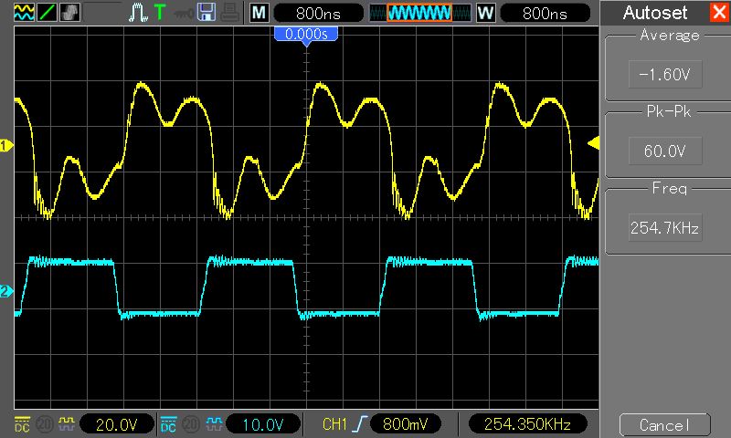 Hallo, Nachdem ich endlich mal wieder Zeit zum Basteln finde, habe ich meine Teslaspule fertig gebaut. In der Schaltplan.gif habe ich mal die Messpunkte eingezeichnet: Messpunkt 1: Immer Kanal 2 (Blau) Messpunkt 2: Hantek3_4.gif Kanal 1 (Gelb) Messpunkt 3: Hantek3_3.gif Kanal 1 (Gelb) Zum Zeitpunkt der Messung Wurde nichts an der Schaltung angeschlossen, und die Schaltung wurde mit 12V betrieben(alles aus 1 Netzteil). Ohne den Teil hinterm GDT Übertrager zieht die Schaltung ca.0,05A. Wenn ich jetzt die Ganze Schaltung mit meinen 12V versorge, braucht die Schaltung 0,19A. Dreh ich die Frequenz ganz auf, dann 0,49A. Ohne den Teil hinterm Übertrager schaff ich meine 390 bis 410khz. Mit dem Teil hinterm Übertrager komm ich auf Max. 300khz. Ohne den Teil hinterm Übertrager ist das Signal vom Übertrager astrein. Mit dem Teil hinterm Übertrager ist das Signal naja... (Siehe Hantek3_4.gif). Nun meine Frage(n): Woher kommt der hohe Stromverbrauch, und weshalb bricht die Frequenz so stark ein? Ich hoffe ich hab alles genau genug beschrieben, unf ihr könnt mir helfen. Mfg Pascal