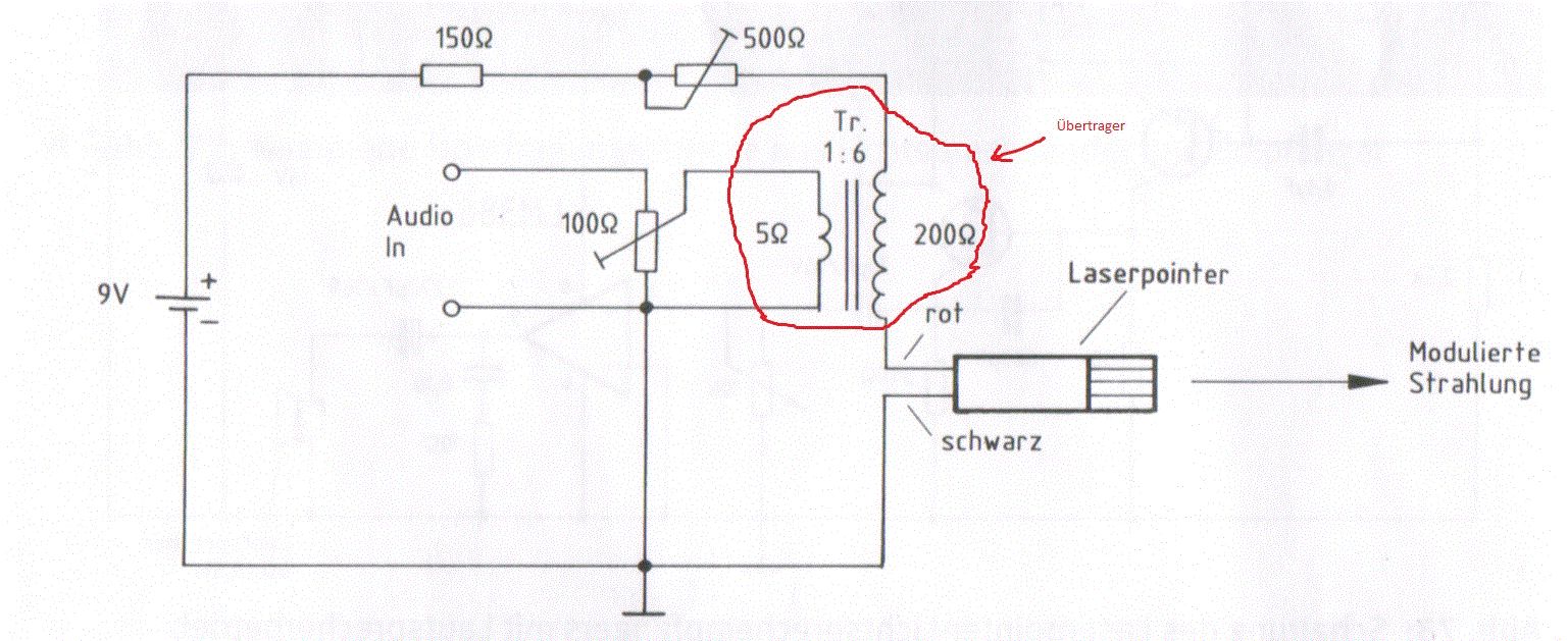 Es gab mal Licht-"Funk"-geräte als Kinderspielzeug, im letzten "Funkamateur" (Nov. 2011) war ein Artikel von DJ1EE dazu mit Abbildungen. Das war eine gewöhnliche Taschenlampe, deren Lichtkegel von einer spiegelnd beschichteten Membrane umgelenkt wurde, auf die man von hinten aufsprechen mußte. Das wäre die simpelste Methode eine Amplitudenmodulation. Die Schaltung oben ist etwas arg einfach gestrickt, werden Laserdioden nicht mit einer Regelschaltung über eine Fotodiode konstant gehalten? In einem einfachen Laserpointer könnte das natürlich eingespart sein.