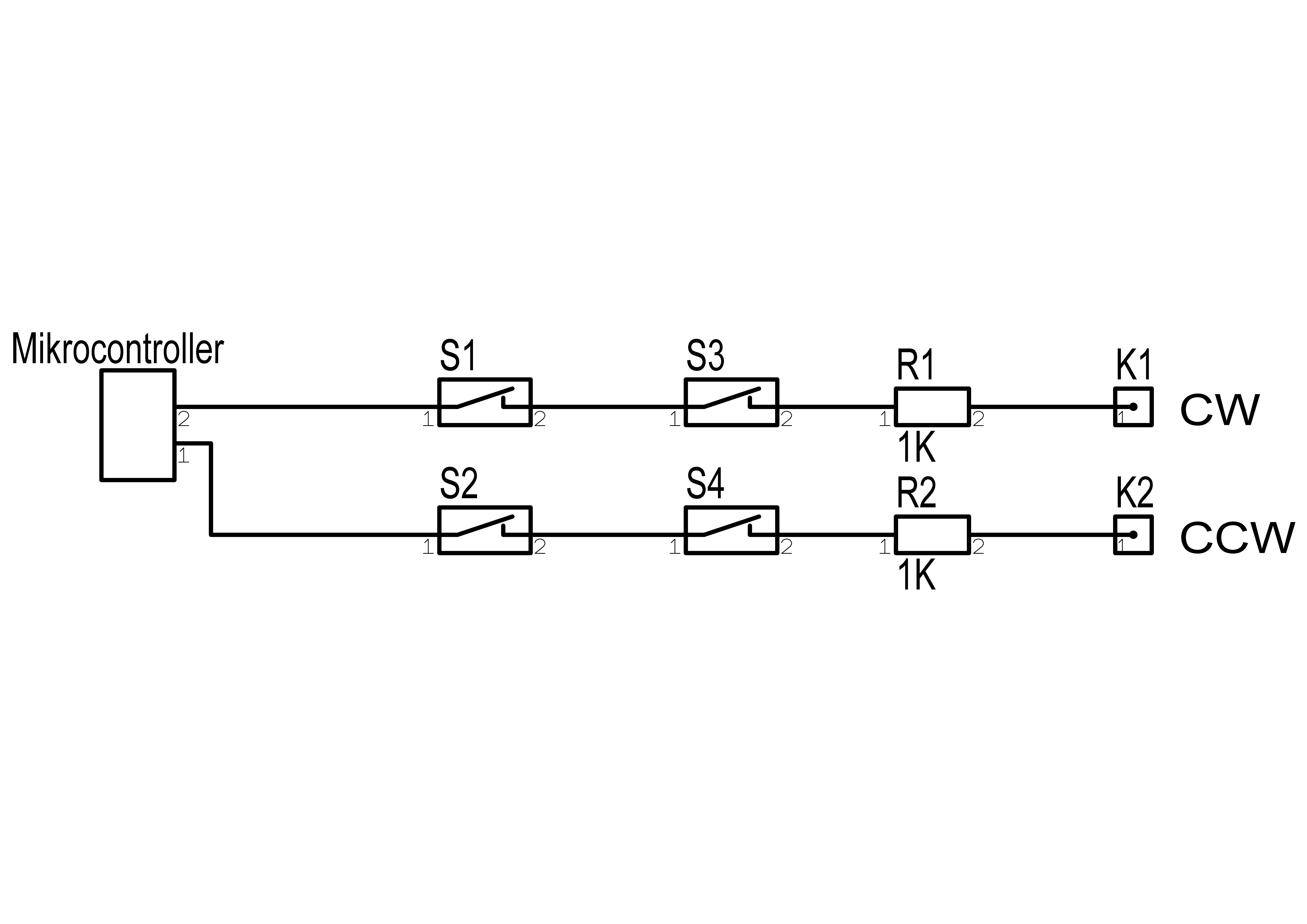 Hallo, mein Ziel ist, mit einem Mikrocontroller (AT90CAN128) und einer H-Brücke einen DC-Motor zu steuern. Ich verwende dazu zwei Ausgangspins des Mikrcontrollers für die jeweilige Drehrichtung des Motors (CW und CCW). Beide Endlagen des Motors werden mit jeweils zwei redundanten Reed-Kontakten überwacht(S1 und S3 bzw S2 und S4 in der angehängten Skizze). Bei Erreichen der Endposition sollen die Reedkontakte das Steuersignal des Mikrocontrollers unterbrechen. Ich möchte nun zusätzlich den Zustand aller Endschalter mit dem Mikrocontroller überwachen um z.B. den Ausfall eines Endschalters feststellen zu können. Gibt es eine einfache Möglichkeit den Zustand aller Endschalter ohne größeren Schaltungsaufwand abzufragen?