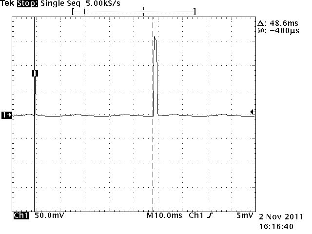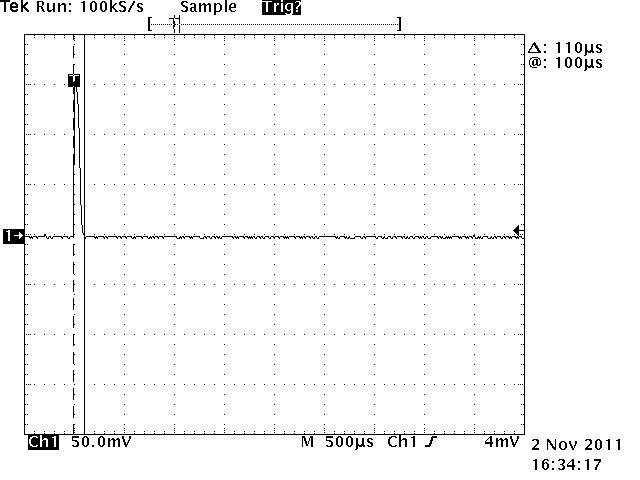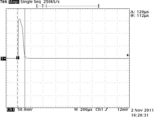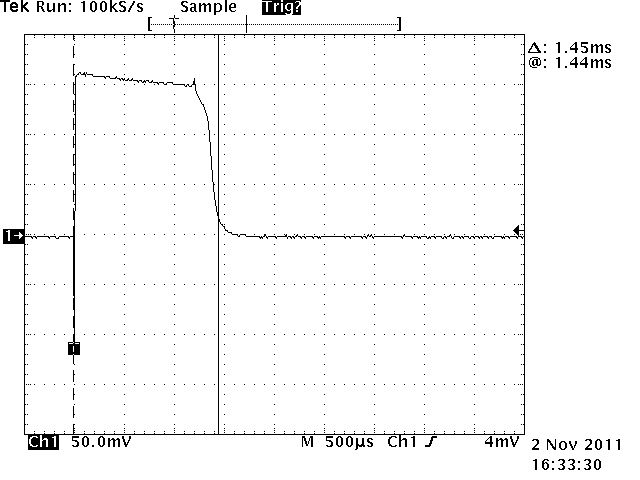 >Bleibt der auch 80 Mikrosekunden lang wenn Du das Blitzgerät mal bei >Einstellung auf 3200 ISO und weit offener Blende unmittelbar in einen >Spiegel entlädst? ISO1600 ist das Maximum was ich einstellen kann. Spiegel hab ich nicht am Arbeitsplatz, aber eine Alufolie tuts sogar noch besser da man damit einen Hohlspiegel formen kann. Damit sind dann ~2/3 des Bildes vollkommen überbelichtet, bei einem Spiegel ist das nur die Punktabbildung der Blitzlampe. Interessanter Weise ist der Abstand zw. Vor und Hauptblitz ISO abhängig, 84ms bei ISO1600 vs. 48ms bei ISO80. Der Vorblitz bleibt in etwa gleich bei 100µs Breite. Der Hauptblitz hat zwischen 1.5ms bei geschlossenem Objektiv und 57µs bei maximaler Beleuchtung bei ISO1600 1/60 F8 Blende. Kürzere Zeiten hab ich bei den paar versuchen nicht zuwege gebracht. D.h. die Blitzröhre muss ~ nach 30µs gelöscht werden. (Die hochfrequenten Störungen kommen wahrscheinlich durch den EM Puls an der Blitzröhre die meine FET Probe auffängt, schliesslich werden da ja einige Amperchen durch die gegend gejagt)