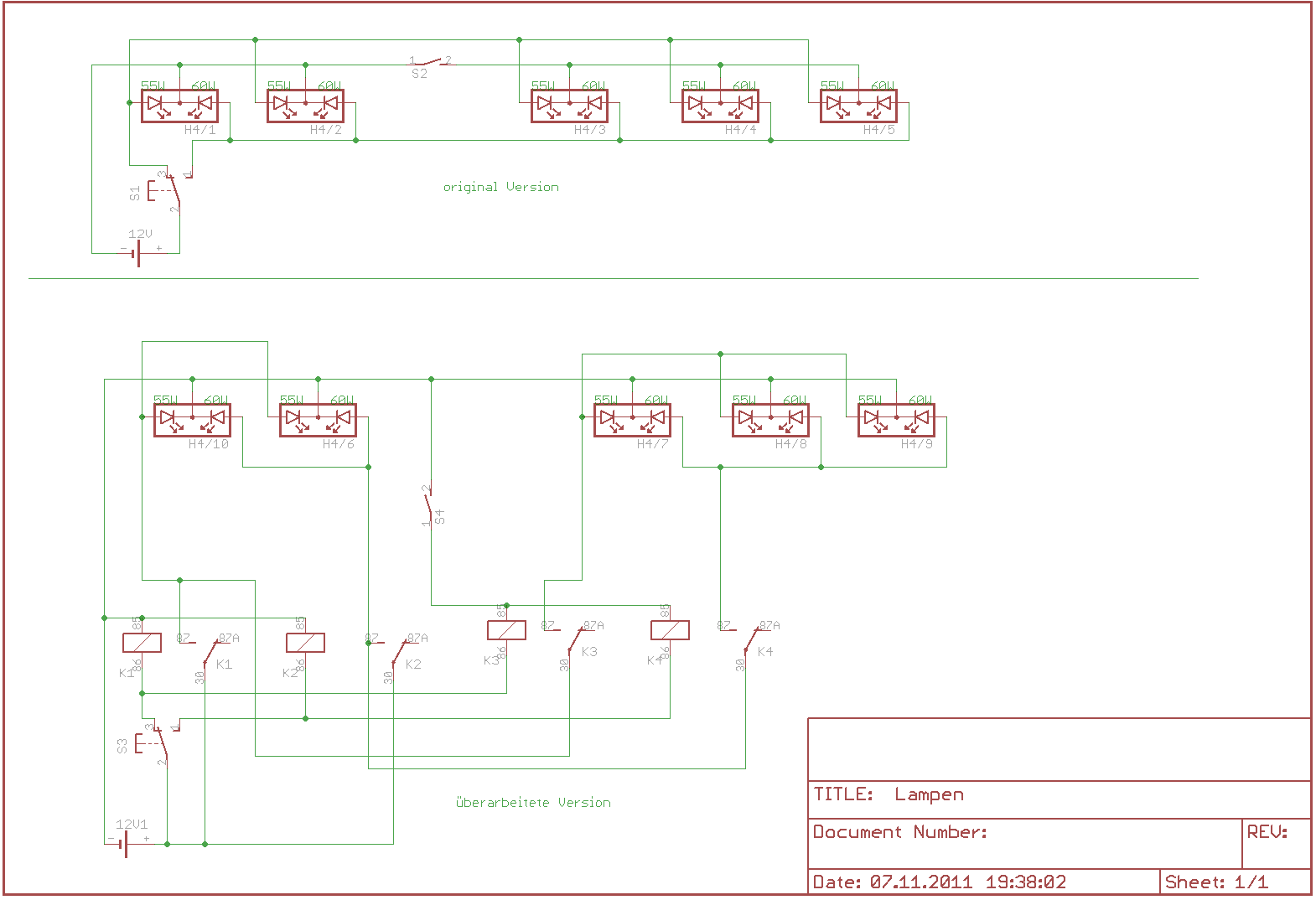 Hallo, ich habe folgendes Problem. Ich fahre ein Quad zum Bäume rücken im Wald. Das Quad wurde von dem Vorbesitzer mit Arbeitsscheinwerfern ausgestattet. Nun habe ich das Problem, dass mir ständig die Schalter für die Scheinwerfer wegbrennen. Ich habe die original Verkabelung mal aufgezeichent, sowie die, die ich gerade gemalt habe. aber habe dazu noch fragen. 1. Lässt sich das noch besser realisieren ohne soviele Relays? 2. Wie lässt sich der Schalter "S4" noch sop verbauen, dass ich nicht noch ein Relay brauche und nicht die ganze lasst über den Schalter läuft. Wenn möglich so, dass ich die Originalschalter verwenden kann. Da ich keine H$ Lampen in eagle gefunden habe, habe ich zweckmässig für den Schalplan Dual-LED genommen und die jeweilige Leistung dahinter geschrieben. Fürs prinzip sollte das ausreichen. Würde mich über Hilfe und Tipps sehr freuen. LG, Sebastian