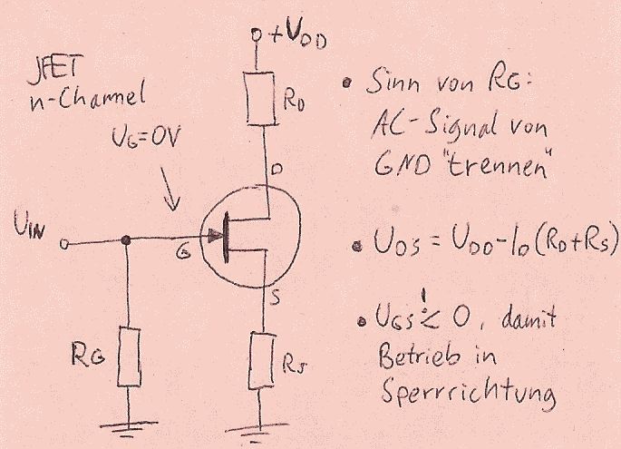 Hallo, ich habe folgende JFET-Schaltung (siehe Anhang). Dabei geht es eigentlich nur um das Biasing. Ich verstehe nicht ganz den Sinn von RG. Mein Lehrer sagt, die Aufgabe von RG ist "das AC-Signal von GND zu trennen". Das verstehe ich nicht, ich habe deswegen nachgefragt und die zweite Erklärung war "RG verhindert eine starke Belastung der Quelle". Aber das verstehe ich noch weniger... Und zwar deswegen: Der Eingangswiderstand des JFET ist größer als RG (laut Lehrer). Wenn ich also zum Eingangswiderstand einen Widerstand RG parallel schalte, dann wird der effektive Widerstand für das eingespeiste Signal doch KLEINER, und gleichzeitig wird die Quelle MEHR belastet. Also beides genau das Gegenteil von der Erklärung?? Ich denke mir folgendes: Aus dem Gate kommt ein kleiner Strom (DC) der einen Weg nach Masse braucht. Wenn ich ein Signal auf die Schaltung gebe das ich mit einem Kondensator einkoppele (AC-Kopplung), DANN brauche ich den Widerstand RG. Sonst nicht. Kann mir vielleicht jemand mit einfachen Worten sagen wofür RG da ist und auch vielleicht wie man ihn dimensioniert?