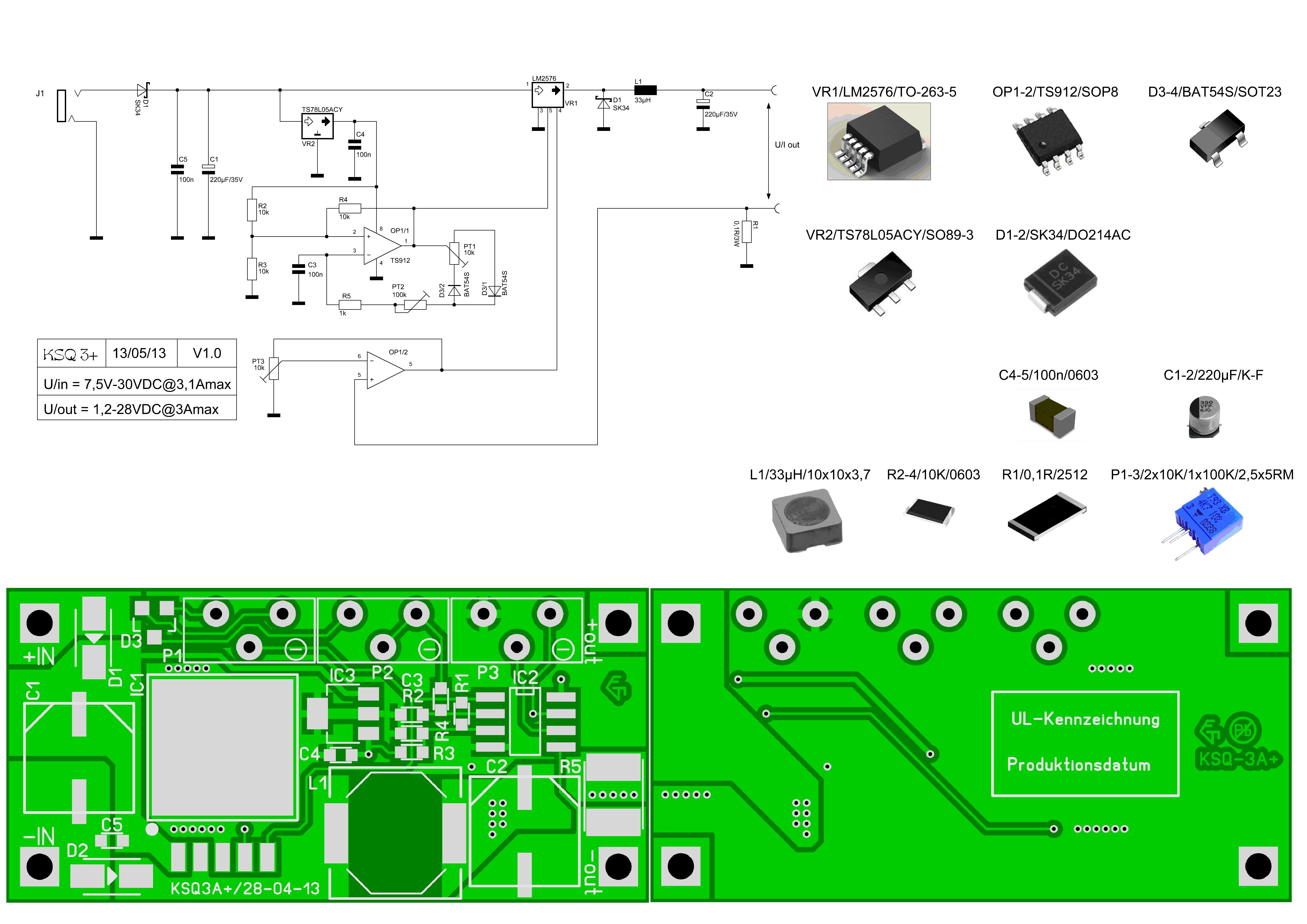 Update: Die zweite Schaltung mit LM2676 funktioniert so noch nicht, Pin 7(On/Off) darf nicht verbunden werden und vor allem nicht gegen masse, da sonst der IC nix macht. Aber auch mit der Korrektur wird der IC warm und auf dem Oszilloskop sieht der In- und Output noch zu wild aus. Da muss noch nachgebessert werden. MfG J. Hebeler