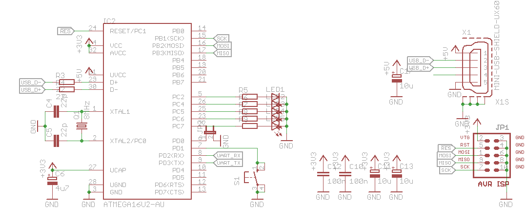 Hi, ich versuche gerade, USB auf einem Mega16U2 zum laufen zu bekommen und bleibe so ziemlich am Anfang hängen. Da ich durch Dummheit den vorinstallierten Bootloader gelöscht habe kann ich nicht sicher sagen, ob das USB-Interface wirklich korrekt angeschlossen ist. Da ich mich aber an die Vorgaben im Datenblatt gehalten habe, gehe ich davon aus, nicht allzu viel falsch gemacht zu haben. Die Hardware wird über den USB per AVR-internen 3,3V-Regler versorgt, was soweit auch funktioniert. Ein Testprogramm, das nur die LEDs blinken ließ, funktionierte soweit bei angeschlossenem USB. Um nun näher ans Ziel zu kommen, habe ich eines der Beispiele (LEDNotifier) aus der LUFA-Bibliothek auf meine Hardware angepasst und die Firmware auf den IC heruntergeladen. Fusebits sind insoweit angepasst, als dass die CKDIV8 sowie HWBE-Fuses deaktiviert sind (E: 0xFF, H: 0xD9, L: 0xDE). Leider kommt unter Windows (zwei unterschiedliche Rechner) die nicht viel sagende Meldung "USB-Gerät wurde nicht erkannt." Entdeckt jemand von euch einen Fehler in Soft- und/oder Hardware oder hat einen Tipp für einen Einsteiger in Sachen HW-USB auf den AVRs? Viele Grüße Chris