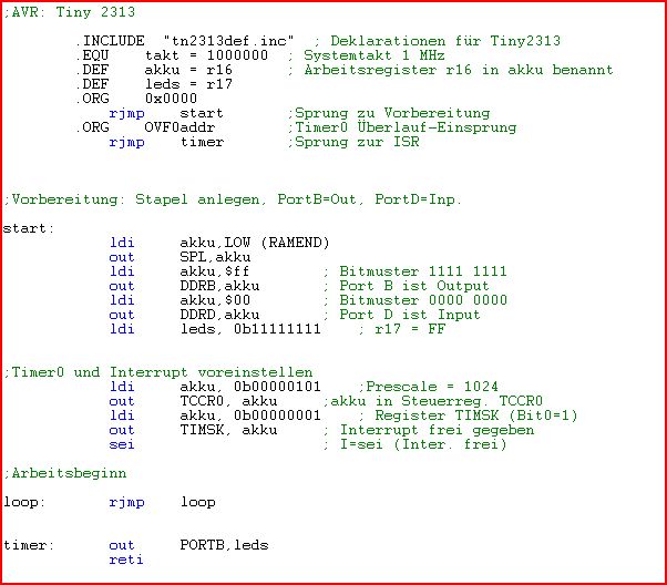 Hi >;Interrupt - ISR >timer: push r16 ;Register retten > in r16,SREG ;Statusregister > ldi r16,1 > out PORTB,r16 > reti Das Sichern von SREG macht nur Sinn wenn man es auch wieder rekonstruiert. Push und Pop funktionieren nur wenn es genau so viele Pushs wie Pops gibt. Und warum erfindest du einen eigenen Namen für den Interrupt. Nimm den aus dem Datenblatt. Da weiß jeder, was gemeint ist.
