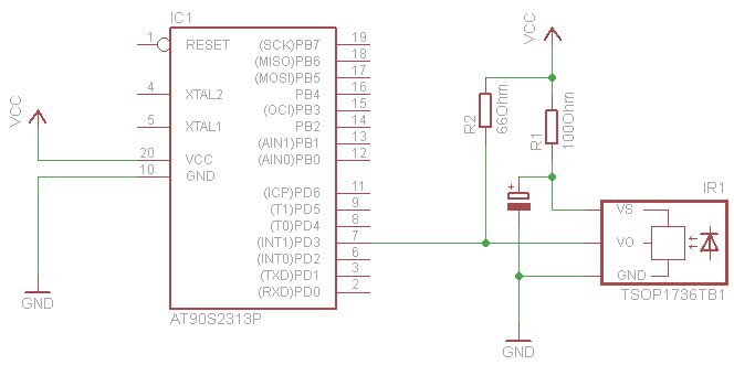 Der 100 Ohm Widerstand befindet sich in der Plusleitung zum IR-Empfänger