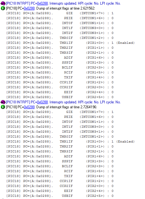 ich hab gerade mit der programmierung von einem PIC18F4550 begonnen. IDE: mplab + proteus/isis compiler: C18 vorkenntnisse: 8051, AVRs ich bin durch ein wenig googeln nun darauf gekommen, dass der pic18f generell nur 2 interruptvektoren kennt, 0x08 für high priority und bei 0x18 für high priority. so gut so weit. leider wird meine ISR (Timer1_ISR()) nie ausgeführt? code ist copypasta. gibt es denn keine möglichkeit dem compiler zu sagen: die funktion soll meine timer1 isr sein? ausser über die flagunterscheidung. der timer1 interrupt tritt jedenfalls auf, sagt isis (siehe screenshot). vielleicht kann man der simulation auch nicht ganz trauen.