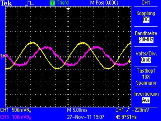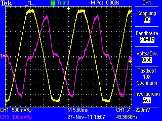 Hallo And.!, mir fiel gerade ein, dass ich noch ein paar 10mH stromkompensierte Drosseln von Reichelt vorrätig habe: sind nicht von Talema sondern von RADIOHM und haben 1A Nennstrom statt die von Dir verlinkten 1,2A. Ich habe die beide Spulen in Reihe geschaltet und vermessen, siehe Oszi-Bilder. Die gelbe Kurve misst den Strom über einem 140-Widerstand. Die Lila ist die über den Spulen abfallende Spannung. Bis 3,5 mA (!) sind kaum Verzerrungen sichtbar. Bei über 10 mA sieht's schon übel aus. Also für deinen Zweck unbrauchbar. Man könnte zwar die Sache auch errechnen, dazu braucht man die Windungszahl (schätze mal 2x100Wdg), die Geometrie (A, d=12mm) sowie die max Flußdichte (o.g. 300mT): ist recht umständlich.