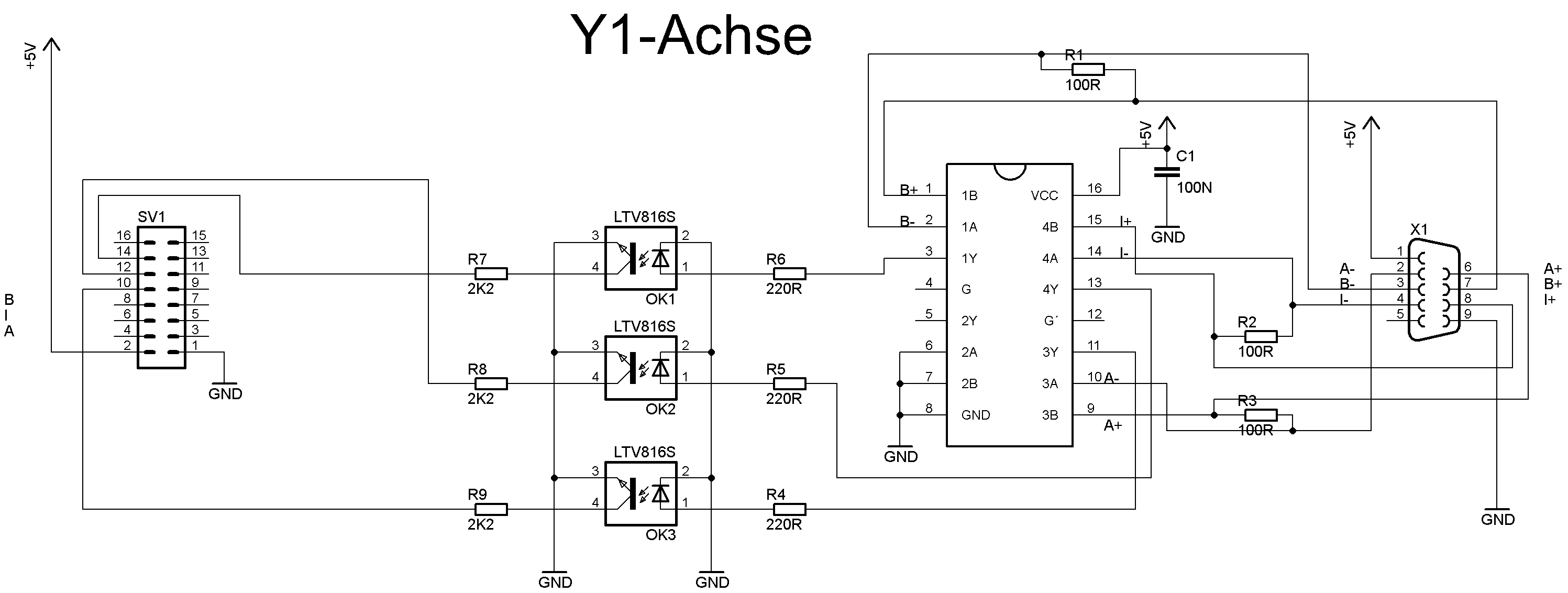 Hallo, ich habe an einer eigenbau CNC Maschine Schrittmotoren mit montieren Encodern im Einsatz. Da die Encoder ein differenzsignal für die beiden Kanäle und den Index Ausgeben können und meine Leitungslänge über 2 Meter ist wollte ich das differenzsignal auch nutzen, die Steuerung für die Schrittmoren kann das differenzsignal nicht Auswerten und will pro Kanal oder Funktion nur eben ein High-Low Signal. Ich habe den im Anhang befindlichen Schaltplan gezeichnet und das Board geroutet, würde mich freuen wenn sich das jemand ansieht und mir sagt was ich alles vergessen habe oder was mist ist. Das andere ist, sehe ich das richtig, der Line-Receiver invertiert das Eingangs- zum Ausgangsignal? Meine Optokoppler invertieren das Signal dann wieder, also sollte das wieder passen oder? Die beiden Datenblätter hab ich anghängt. Vielen Dank für eure Hilfe. Gruss Reini!