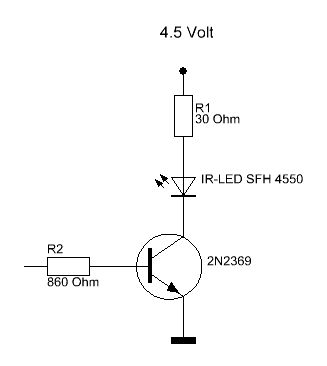 Das UCE vergessen wurde, ist nicht so schlimm: dafür wurde die Flusspannung mit 1,5 V reichlich hoch angesetzt. In der Summe kommt das dann etwa hin. Für ein 38 kHz IR Signal wird das Signal wohl moduliert sein. Für mehr Signalstärke könnte man damit auch mehr als 100 mA nutzen. Dauerhaft 100 mA bei den IR LEDs setzen schon schon etwas Kühlung über die Anschlüsse voraus.