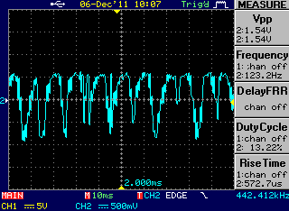 >Aber eh, mal zum Verstaendnis, was zum Teufel macht C5 und R5 und warum >ist das Resultat gleich das garnichts mehr geht? Die Bilden den Regler, der vorher beim TL-431 war. Der Optokoppler überträg nur die Ausgangspannung. Ohne dieses RC-Glied wird das ganze schwingen. >nur wie machen die das wenn unterschiedliche lasten drann haengen? Wenn die Last steigt bekommt auch die pimäre Wicklung weniger ab. Als Folge sinkt die Spannung und der Regler macht auf, also erhöht den Primärstrom und damit das dutycycle. >Und da kam ein TL431 nicht vor. Ja stimmt. Zeit wär auch zu kurz. Ein TL-431 ist ein verdammt praktisches Bauteil. Es gibt in mit genauerer Referenz, nur schnellere sollte es noch geben. >Nachdem das scheinbar dein erster Flyback-Wandler ist: Prüf >mal ob du die Windungen richtig herum "gepolt" hast. guter Tipp. Ansonsten arbeitet der im Flußbetrieb und nach einem kurzen puls geht die Strombegrenzung an. Dann sieht man nur geringe Spannung. @Simon, miss doch mal die DS-Spannung (runtergeteilt), bzw die Spannung Sekundär am Trafo. Und nenn endlich die Trafodaten. MFG