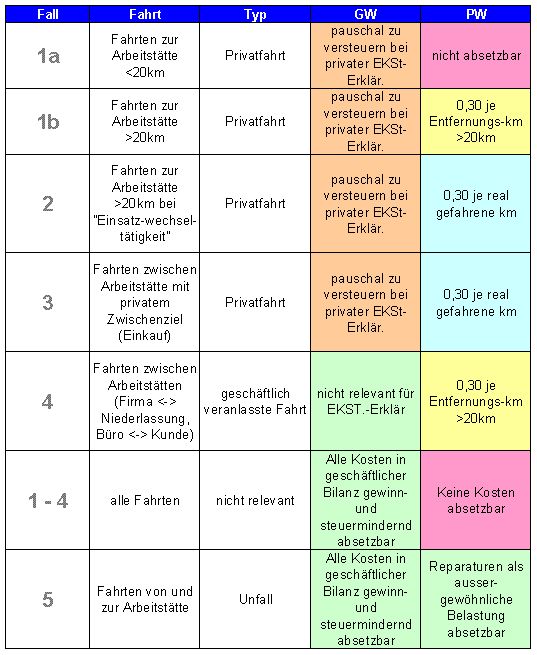 Wie aus der Tabelle zu entnehmen ist, betreffen den der Selbständigen alle Fälle: Privatfahrten, Privatfahrten zur Arbeitstätte und Geschäftsfahrten. Es gibt noch einen Sonderaspekt, der für viele Zeitarbeiter interessant ist: Wer nicht an dem Ort arbeitet, bei dem er offiziell beschäftigt ist, (Kunde und Dienstleister an verschiedenen Orten) betreibt Einsatzwechseltätigkeit und kann die realen km absetzen!