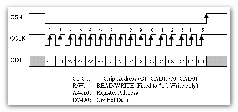 Bessere Kontrolleinheit: Statt direkt an einzelne Steuerpins wie den SMUTE zu gehen, werden vom µC Daten digital in Control Register des AK4396 geschrieben oder von dort gelesen. Bei einer solchen "Steuerung über die Control Register ist ein bestimmtes serielles Protokoll mit Clock- und Datenleitungen einzuhalten. Die Beschreibung davon ist Inhalt deiner beiden Bilder.