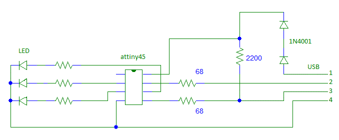 Eine weitere Frage zur Schaltung hätte ich noch: Welchen Zweck erfüllen die beiden Dioden? Außer dass sie für einen Spannungsabfall von 2,4 V sorgen? Dies macht aber für mich gerade wenig Sinn weil der Attiny auch mit 5 Volt läuft?