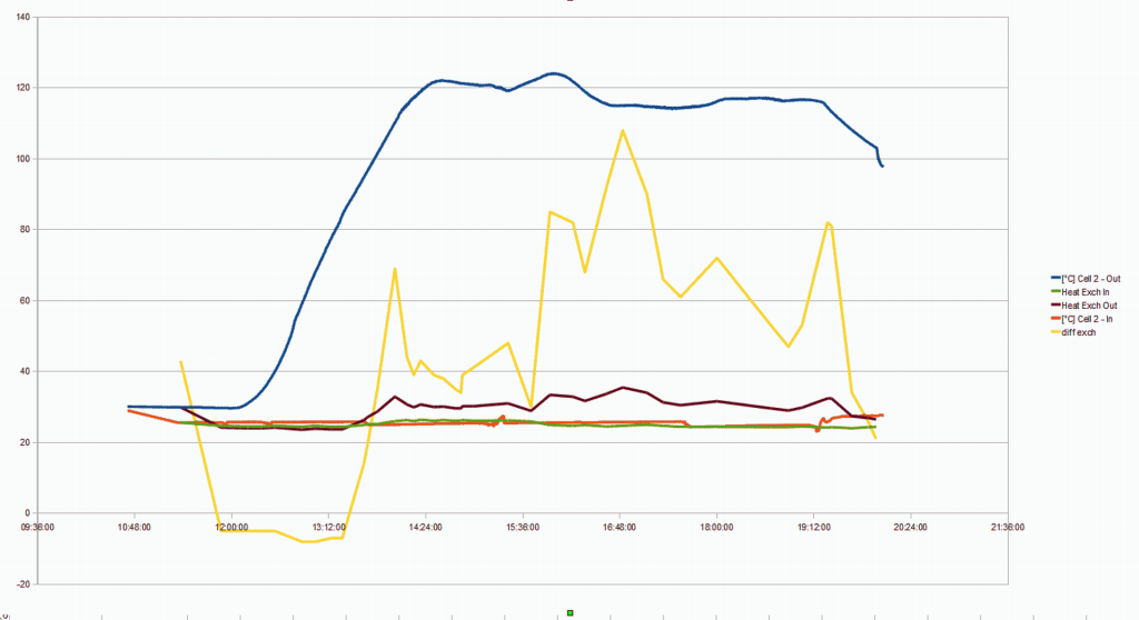habe aufgegeben, die temperaturdiff des wärmetauschers lässt keine aussage zu. von einer konstanten wärme abgabe zu sprechen ist übertrieben (gelbe linie temp diff *10). ich bin raus und das teil ist für mich gestorben.