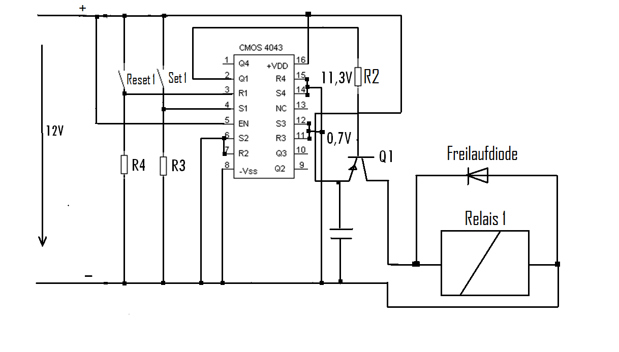 Hallo und Danke für die schnelle antwort Ich teile euch mit das meine Schaltung mitlerweile Funktioniert JUHHHHUUUUUU!! ich bin serh glücklich^^ Habe mich am ende doch für einen npn Transistor um entschieden. >Der Transistor ist an sich richtig verschaltet würd ihm aber noch einen >Widerstand zwischen B und E spendieren. Was bewirkt das ? was hat das für ein zweck? >Hast du denn inzwischen auch das richtige 12V Relais >und passende Widerstandswerte R2=2k2, R3=R4=10k ? Ja, 1X bc875 transistor R3=R4= 6,5 kOhm R2=5,37 kOhm 1X CD4043 relais= 12V, 190,1 Ohm 1X Diode 1X Elko 10µF Die Schaltung funktioniert :D