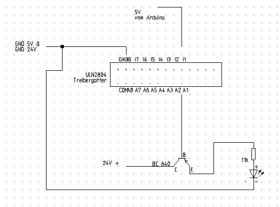 @iggy: Multiplexen ist nicht nötig. Der Programmablauf wird nicht verändert. Ich fang nochmal von vorne an. Die Aufgabe ist folgende: Ein Arduino Microcontroller soll insgesamt 24 Ausgänge mit 24V schalten. Er kann jedoch nur 5V ausgeben. An den Ausgängen hängt jeweils eine maximale Last von ca. 80mA (LEDs in Reihe und Paralell plus Vorwiderstände) Es handelt sich um etwa 270 LEDs. Die Masse der LEDs ist verbunden. Dies kann aufgrund der vorgebenen Bedinungen nicht geändert werden! Meine Überlegung ist nun folgende gewesen: Ich negiere das Ausgangssinal des Arduinos über den ULN 2804. Steuer nun mit diesem GND einen pnp (BD 640) Transistor an, der dann über die C-E Strecke eine Last von 24V durchschaltet. Sprich ich nutze den Transistor einfach als Schalter, der mit GND angesteuert wird. Die Schaltung habe ich komplett aufgelötet doch sie funktioniert nicht. WARUM? Danke
