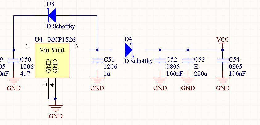 Hi, wie sichere ich einen LDO vor Überspannung am Ausgang richtig? Die Schaltung ist im Anhang. Welche der beiden Dioden ist notwendig wenn VCC größer sein kann als Vin? Beide gleichzeitig macht ja keinen Sinn. Ist D3 oder D4 besser geeignet um die Schaltung zu schützen? Den Spannungsabfall von 200mV, den D4 verursacht kann die Schaltung an VCC verkraften. Also auf Voltage Drop braucht ihr keine Rücksicht zu nehmen.