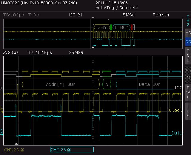 > Ja entwickelt wird auch sehr viel im Berreich µC aber wirklich benötigt > habe ich diese Funktionen bis jetzt noch nicht, nur die Bandbreite bei > meinem jetzigen Oszi(60Mhz, ca. 20 Jahre alt) ist mir zu wennig > geworden. Sobald du ein einziges Mal damit gearbeitet hast willst du nie mehr ohne sein. Ich haenge mal ein Bild an. Das ist enstanden als eigentlich nur die I2C-Busdekodierung meines neuen Hamegs an einem bei mir laufenden Controllerboard testen wollte, und sofort habe ich einen boesen Fehler in meiner Software gefunden. (seufz) > Wahrscheinlich Blöde Frage aber was ist die Signalwiederholrate? > Und was bedeutet das wenn es nur 2000/s hat für mich? Es ist ein Spiel mit Wahrscheinlichkeiten. Es lassen sich Signale vorstellen die selten auftreten die dir das Hameg nicht anzeigen kann, ein Agilent aber schon. Es lassen sich aber auch welche vorstellen die dir auch das Agilent nicht mehr anzeigt. Und das ganze gilt auch nur in bestimmten Messbereichen: http://www.mikrocontroller.net/attachment/113595/mikrocontrollernet_Antworten_HAMEG.pdf Mir war die Busanalyse wichtiger. Sollte ich irgendwann die Wiederholrate vermissen so kann ich mir von den gesparten 2kEuro jederzeit ein schnelles analoges Oszi unter den Hameg stellen. Olaf
