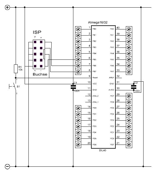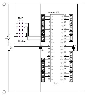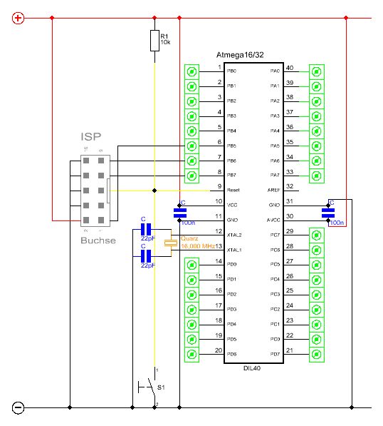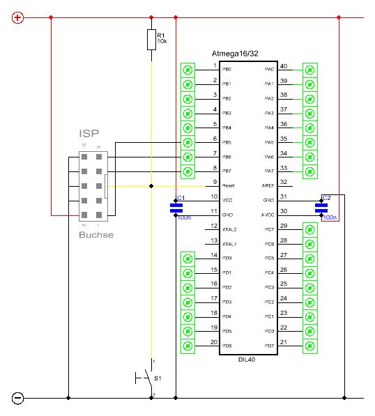 Das jemand was lernen will, kann ich nur unterstützen. Auf deinem Screenshot kann ich zwar nicht wirklich viel erkennen, aber ich versuchs mal. Zunächst ist der Reset Pin am Atmega active low, das heißt der Chip ist im Reset-Zustand, wenn er low also 0V ist. Bei nicht gedrücktem Schalter wäre er bei dir dauer-low. Du musst den Widerstand gegen 5V bzw high schalten und den Schalter gegen low. So wird dann der Atmega bei gedrücktem Schalter resettet. Zum ISP: http://www.atmel.com/dyn/resources/prod_documents/AVRISPmkII_UG.pdf Da auf Seite 26 steht die Pinbelegung, einfach nur die Pins mit selben namen verbinden. Da siehst du auch, dass der ISP einen Resetpin hat. D.h. der Reset-Zustand wird beim Programmieren aktiviert. Dann steht der Chip zwar immer noch unter Strom, aber spult das Programm nicht ab, sondern ist im Programmiermodus. Falls du einen AVR ISP mkII hast (Investition lohnt sich für ca. 40€) kannst du den ISP Port auch so beschalten wie ich in dem Screenshot. P2 ist bei mir die ISP Schnittstelle. Für die Anteuerung über den PC ist für den Anfang immer ein virtueller COM Port recht einfach zu realisieren. Vielleicht helfen die meine Screenshots da weiter. Du brauchst nur eine USB Buchse und nen FT232RL, den beschaltest du wie im Bild und verbindest die RXD und TXD Ports miteinander. Wichtig ist nur, dass RXD am Atmega zum TXD am FT232RL und TXD am FT232RL zu RXD am Atmega gehen. Dein Glück, dass ich da auch nen Atmega16 genommen hab, ansonsten halt einfach ins Datenblatt schauen und gucken welche Pins RXD und TXD sind. Danach kannst du das ganze relativ einfach über UART benutzen, gibt hier auch viele Programmierbeispiele zu UART/USART. Musst nur die richtige Baudrate programmieren. Viel Erfolg.