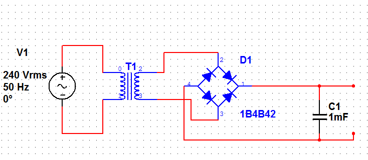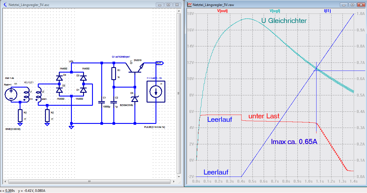 Hallo Flo T. 1. Windungsverhältnis=Übertragungsverhältnis=240Veff/15Veff=16 2. Der Brückengleichrichter (Graetz-Schaltung) bewirkt zusammen mit dem Ladekondensator, dass über diesem eine Gleichspannung etwa in Höhe der Spitzen-Wechselspannung aus der Sekundärwicklung anliegt (abzüglich der Flußspannungen der in Durchlassrichtung arbeitenden Dioden D4+D1 oder D3 + D2 ). 3. C1 bewirkt eine Glättung der nach der Gleichrichtung sonst stark pulsierenden Gleichspannung. Die Ausgangsspannung von 5V wird zweckmäßiger Weise mit einem Spannungsregler eingestellt. Dazu kann man ein fertiges IC z.B. 7805 verwenden. Die Funktion wird aber stark vereinfacht durch einen Längsregler mit Transistor, Z-Diode und Vorwiderstand eher verständlich. 4. R1 führt Spannung und Strom an D5, eine Zenerdiode mit 5,6V Durchbruchspannung. 5. Diese Spannung liegt an der Basis von Q1. 6. Q1 wird zwischen Kollektor und Emitter nur dann leitend, wenn der Unterschied zwischen Basis und Emiiter ca. 0,65V beträgt, denn nur dann kann ein Steuerstrom in die Basis fließen und die Kollektor-Emitterstrecke aufsteuern. Damit beträgt die zwischen Emitter und GND anstehende Spannung, bis zu einem bestimmten maximalen Laststrom ca. 5V. Ein Spannungsregler z.B. 7805 regelt natürlich genauer, weniger lastabhängig und überlastsicherer, denn er enthält einiges Mehr an Funktionen wie diese wirklich einfache Schaltung. Anmerkung: R3,R2 und die diversen Vermerke ganz links hängen mit der Simulation in LTSpice zusammen. Gruss GroberKlotz