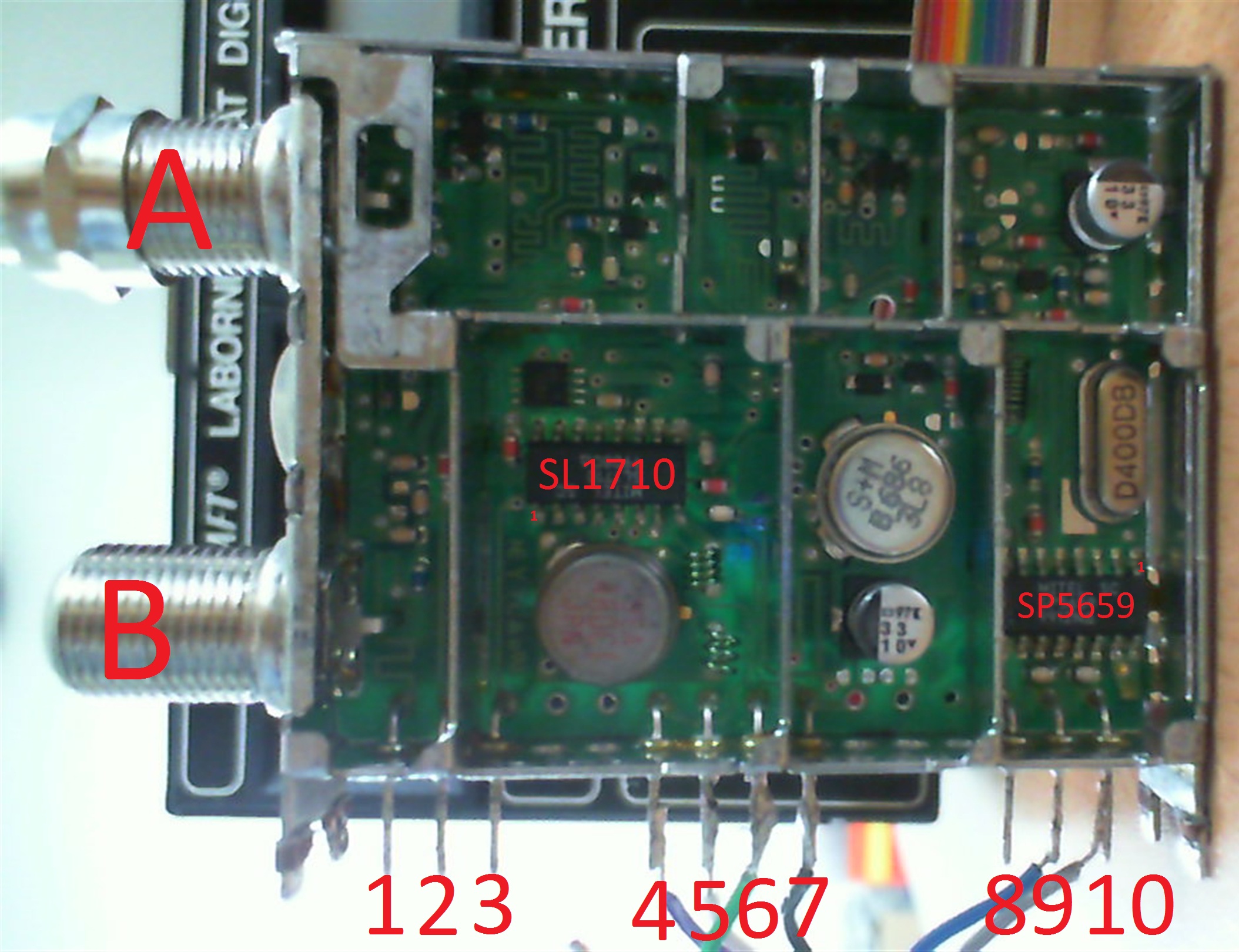 Hallo, danke für die Antwort. Ich poste gleich zum Anfang ein Datenblatt vom orginal verwendeten Tuner. Das ist ein ALPS der BSK-Serie. Allerdings verwende ich hier einen der BSD-Serie. http://www.lll.lu/~edward/edward/adsb/tunerdb/BSKseries.pdf Die hinteren drei PINs sind ohne Zweifel für den I2C-Bus. Zwei der vorderen PINS führen jeweils zu einem Mittelleiter der LNBs+. Der dritte vordere PIN führt über einen Wiederstand und einer Kapazität zum 7. PIN aus dem mittleren Segment. Dieser führt auch an den SL1710 PIN 8, der im Datenblatt mit VEEC beschriftet ist (=GND). Beim PIN 4 aus dem zweiten Block vermute ich den 5V, da er zu VCCB und VCCC des SL1710 einen sehr geringen Wiederstand aufweist (<100Ohm). Was PIN 5 und 6 macht, ist mir nicht bekannt - vermutlich der BB und P3. Gruß Sven