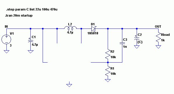 Im Anhang hab ich mal mit 22u, 100u und 470u simuliert. Die Kurve ohne Überschwinger ist die mit 470uF. Probier mal 1000uF parallel 22uF. Hat deine Spule wirklich nur 4,7uH bis max. 10uH?