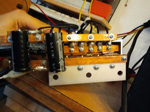 Niederinduktiv ist etwas anderes. Zeichne in den Bildern die Strompfade ein. Mit den Axialen Kondensatoren spannst du eine riesengroße Fläche auf. Nur weil es Schienen sind ist das ganze auch nicht induktiver. Jeder Fet ist mit einer anderen Induktivität mit den Kondensatoren verbunden. Üblicherweise verwendet man Kupferbleche welche übereinander wie bei einem Zweilagigen PCB plaziert sind. Durch diese Bleche stoßen die Anschlussbeide der Mosfets und der Dioden. Rundherum die Kondensatoren zum Abfangen des Stromrippels. Die Elkos eignen sich dafür überhaupt nicht. Einer kann vl 2A-4A Stromrippel. Nimm Folienkondensatoren, ab besten welche für hohe Pulsströme. Gatesignal auch beachten, bzw wie lange der Fet im Miller Plateu hängt. Gefährlich kann eine zu große induktivität am Source werden. Denn diese verlangsamt die Schaltflanke am Gate, auch wenn der Treiber ein scheibar schönes Signal ausgibt. MFG Fralla
