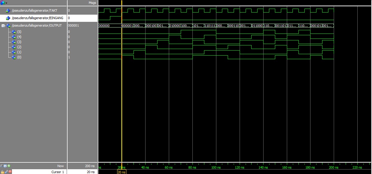 Ich möchte pseudenzufallsgenerator mittels VHDL entwerfen. irreduzibles Polynom: x^6 + x^5 + x^3 + x^2 + 1 (1101101) Aber irgendwie scheint es falsch zu sein. Was ist denn falsch? VHDL-CODE: entity pseudenzufallsgenerator is port( TAKT : in bit; EINGANG : in bit ); end pseudenzufallsgenerator; architecture arch of pseudenzufallsgenerator is signal Z : bit; signal D : bit_vector(5 downto 0); begin FF: process(TAKT) begin if TAKT'event and TAKT='0' then Z <= D(5); D(5) <= D(4) xor Z; D(4) <= D(3); D(3) <= D(2) xor Z; D(2) <= D(1) xor Z; D(1) <= D(0); D(0) <= EINGANG xor Z; end if; end process FF; end arch;
