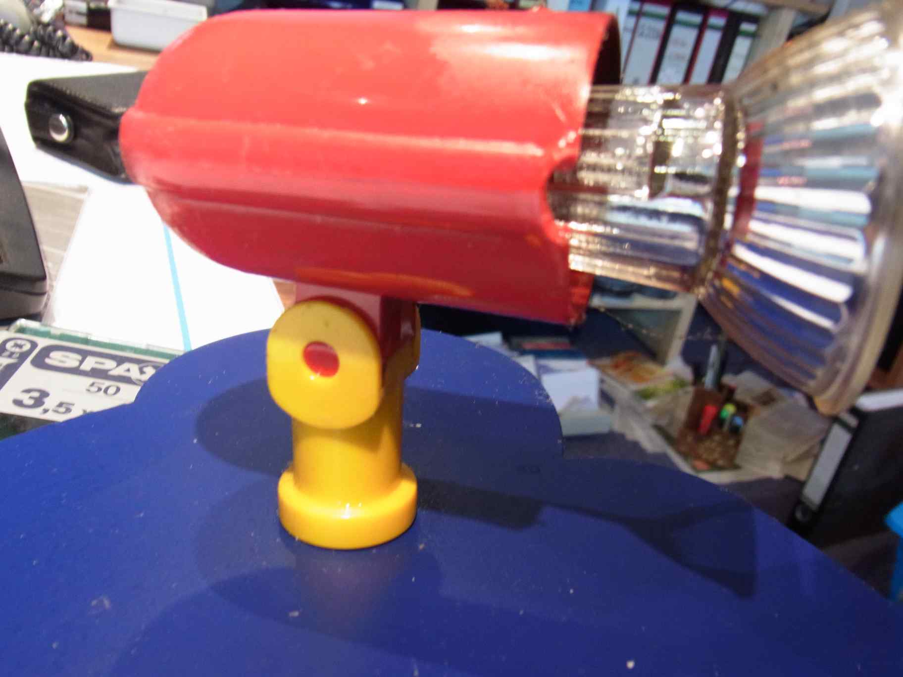 Hallo! Wir haben eine Wandlampe, die aus einem Blech mit zwei schwenkbaren Spots (E14, Strahler) versehen ist. Bei einem dieser Spots ist nun das auf dem Bild gelbe Halterungsstück zerbrochen, so dass die Glühlampe mitsamt Fassung nur noch traurig herunterhängt. Gerne würde ich da passenden Ersatz einbauen, evtl. auch zwei gänzlich neue Spots dranmachen (die Halterungen für die Lampen-Ringe sind ja auch schon arg...). Leider habe ich bisher nix passendes gefunden. Es müsste haben: 1. eine Einloch-Montierung bei der man die Kabel zentral durchziehen kann. 2. buntes Aussehen, am besten wieder gelb-rot (weil die Basis blau ist) Hat da jemand einen Tipp?