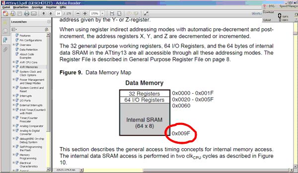 Hi >wie muß ich das verstehen mit den 9F? Das ist einfach die höchste Adresse im RAM. Befehle wie rcall, call und push legen dort Adressen bzw. Registerinhalte ab. Und befehle wie ret oder pop holen sich die Werte von dort. >Außerdem habe ich den PC abgesucht nach solch einer "Include" >Datei...und nichts gefunden, merkwürdig! Brauchst du eigentlich nicht suchen. Beim 4er Studio findest du die Datei nach dem Assemblieren in der Projektverwaltung (Anhang). Die Include-Dateien befinden sich im AVR-Studio-Verzeichnis unter AVRASSEMBLER(2)->APPNOTES bzw. AVRASSEMBLER->INCLUDE (5er Studio). MfG Spess
